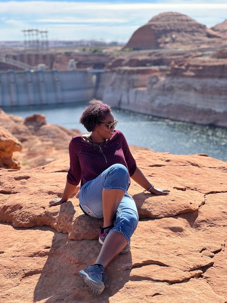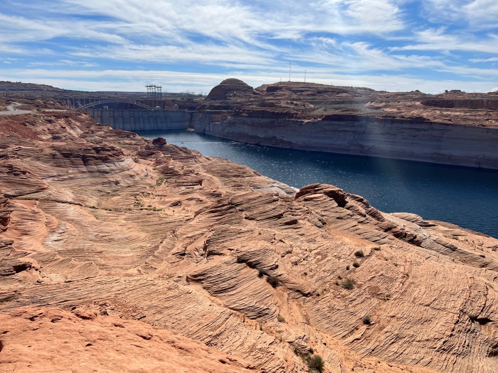 Sur la route, nous avons fait un stop au lac Powell situé à ville de PAGE (à environ 180 km de Springdale soit 2h30 de route). Le lac Powell est un lac artificiel créé sur le fleuve du Colorado par le barrage de Glen Canyon achevé en 1963. D’une longueur de 476 mètres pour une hauteur de 220 mètres de béton, c’est le 4ème plus grand barrage des Etats-Unis. Plus de 24 millions d’habitants des Etats voisins (Utah, Colorado, Nouveau-Mexique, Nevada et Californie…), dépendent de ce lac, tant au niveau de son eau que de la production électrique générée par le barrage. Le pont métallique de Glen Canyon à proximité du barrage permet la traversé sur la route US 89.