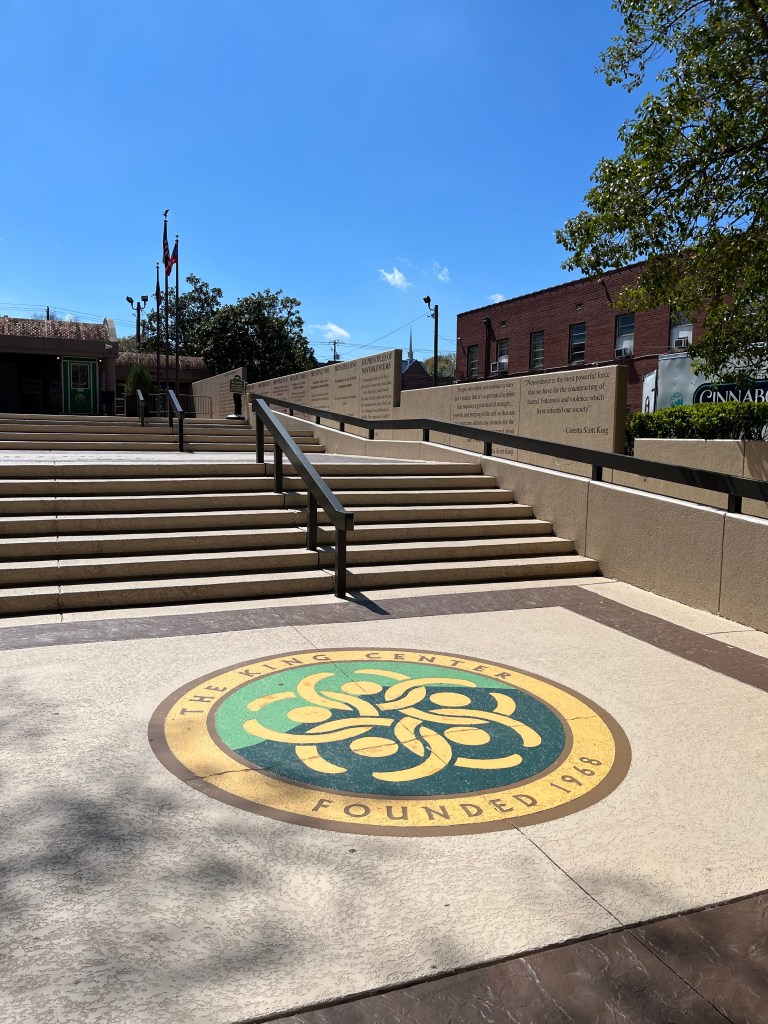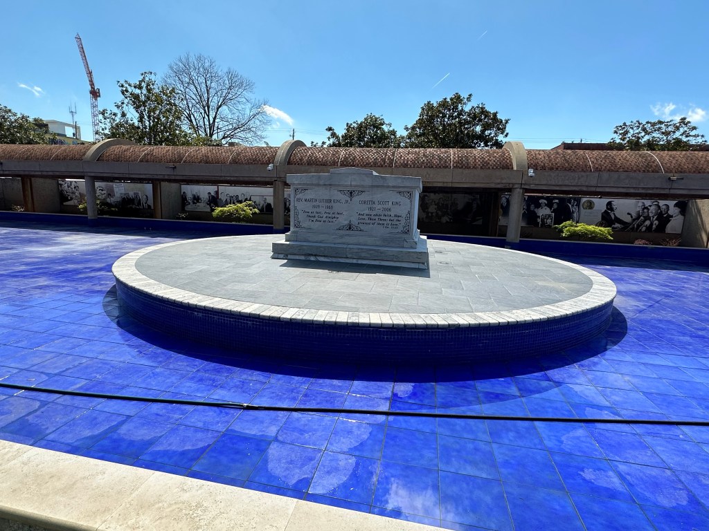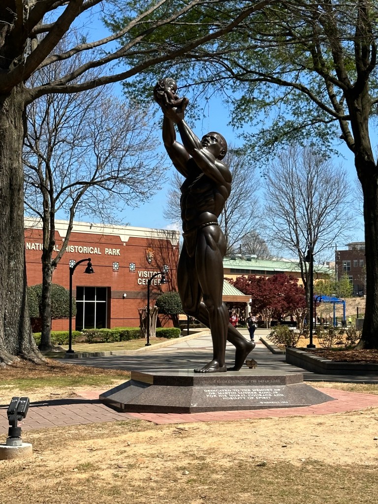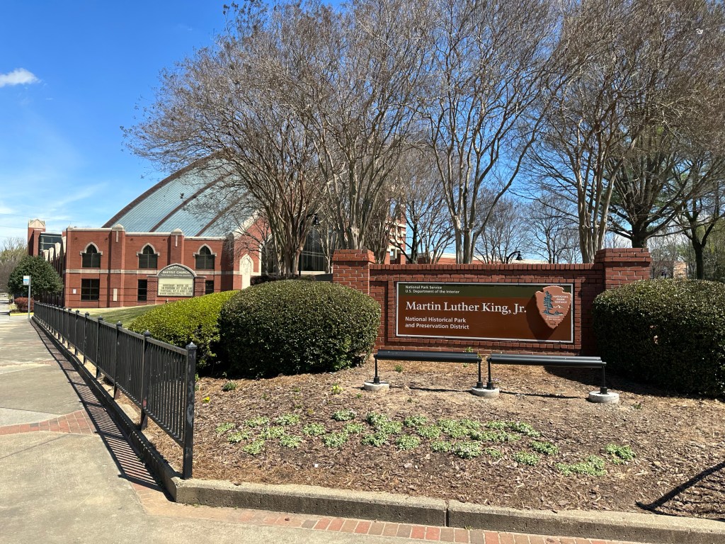 Après la visite du parc centenaire, nous avons pris le tramway pour nous rendre au parc national et historique dédié à Martin Luther King (maison natale et lieu de sépulture). Pasteur baptiste et militant non-violent pour le mouvement américain des droits civiques, Martin Luther King (MLK) est né à Atlanta le 15 janvier 1929 et décède assassiné le 4 avril 1968 à Memphis. Il a oeuvré pour la paix et contre la pauvreté. Le parc historique national Martin Luther King, a été créé en 1980 pour préserver les lieux où MLK Jr est né, a vécu, travaillé, adoré et est enterré.