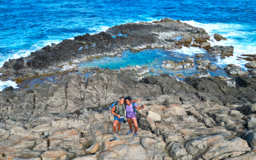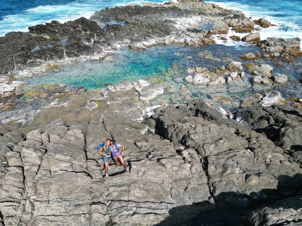 NB : La baignade est interdite car très dangereuse à l’oeil bleu. La piscine naturelle peut à n’importe quel moment être envahie par de grosses et puissantes vagues qui ne pardonneront pas à ceux qui s’y risqueraient.