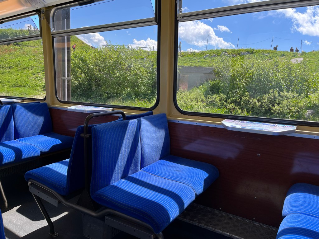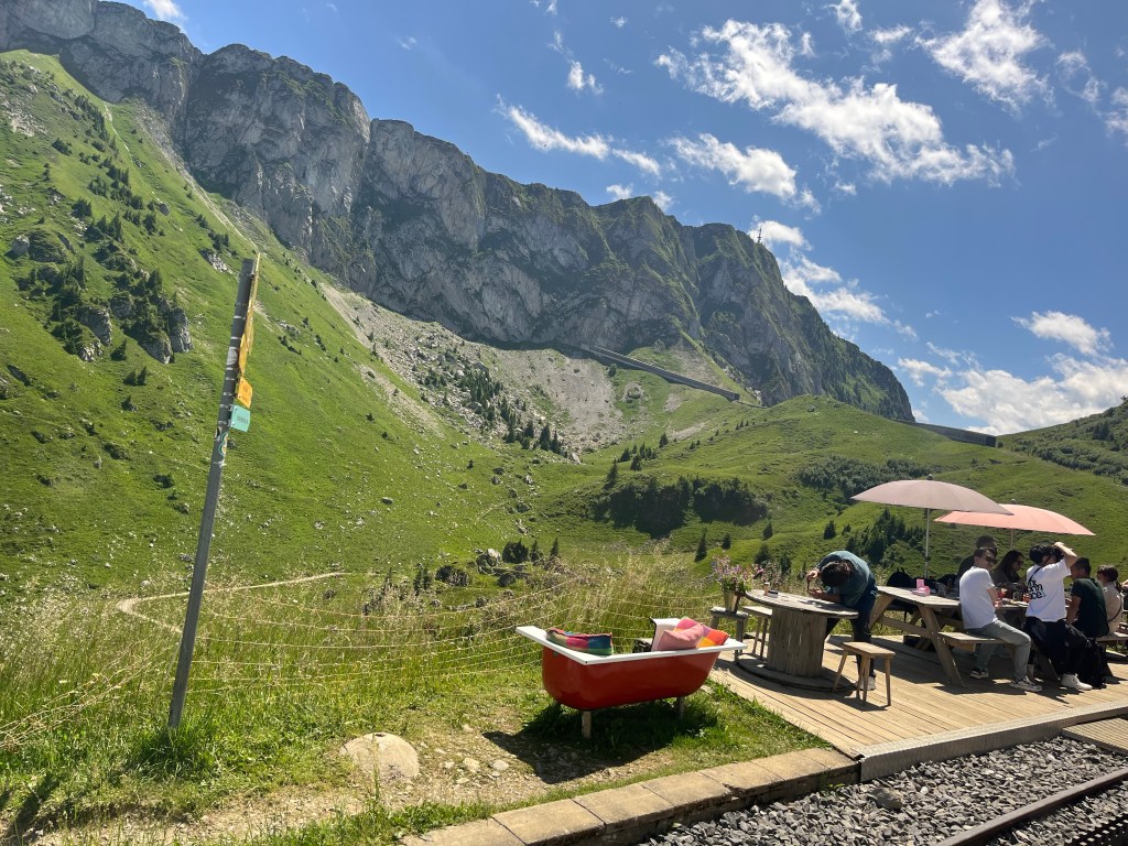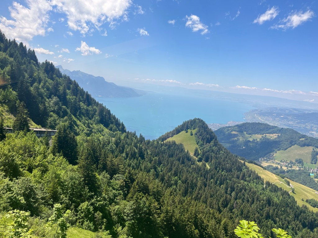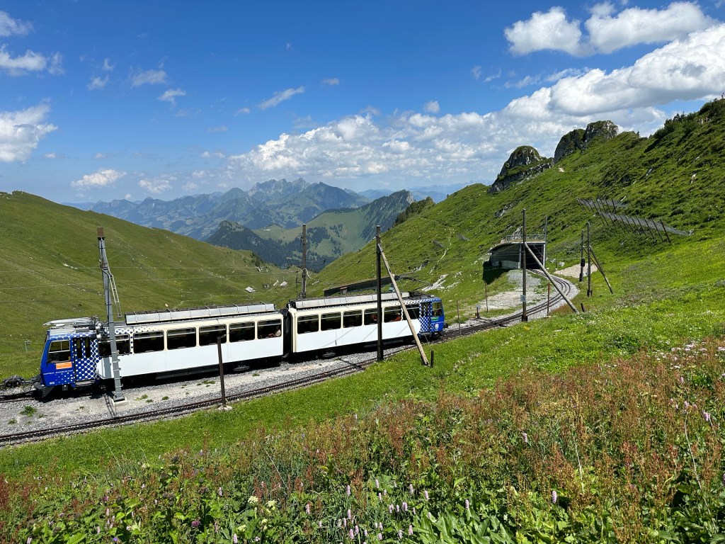 Nous sommes montées jusqu’à Glion où nous avons pris le train à crémaillère qui nous mène aux Rochers-de-Naye. Le train nous a offert de splendide vues panoramiques sur le lac et les montagnes (très belle expérience).