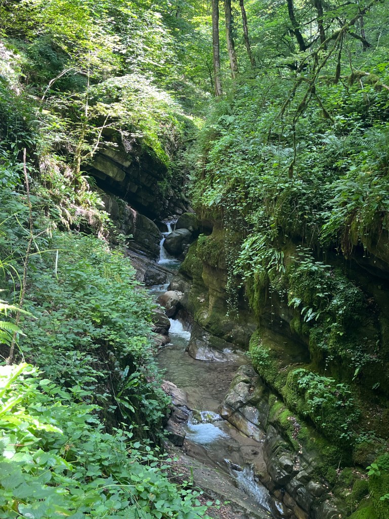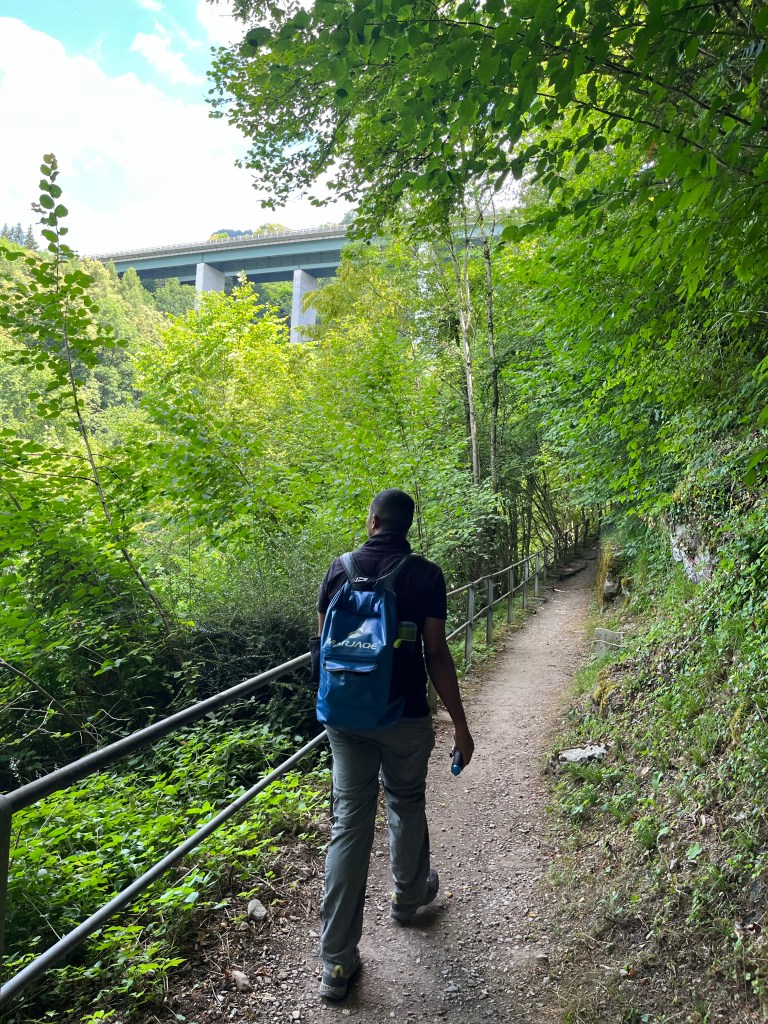Le sentier est très balisé, ombragé ; on suit le bord de la rivière appelée la « baye » (affluent du Rhône et confluent dans le lac Léman à Montreux). Le paysage est très végétal et minéral, très rafraîchissant par cette chaleur d’été.