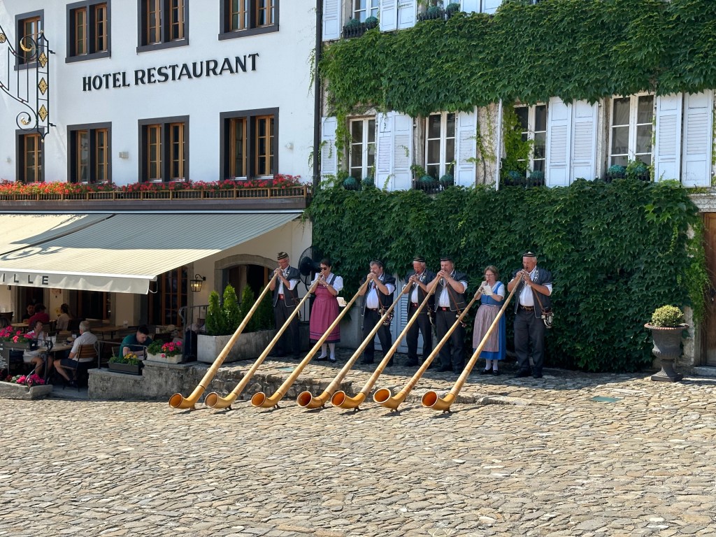 Après la visite du château, nous avons déambulé au niveau de la cité avec ses boutiques et restaurants. On a eu la chance d’assister à la prestation musicale des célèbres joueurs de Cor des Alpes.