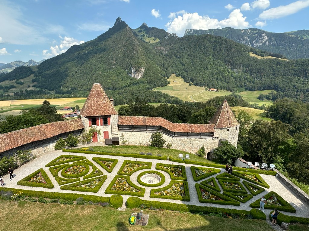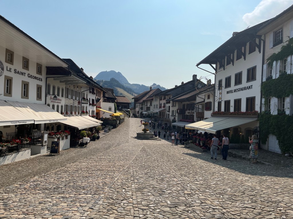 Située à environ 30 min de route de Vevey, la ville de Gruyère appartient au Canton de Fribourg. Elle est essentiellement connue pour sa cité médiévale très prisée des touristes, mais également pour son fromage goûteux le « Gruyère AOP » (fabriqué à partir du lait des vaches fribourgeoises tachetées de noir et blanc). Perchée sur sa colline, la bourgade médiévale, entièrement piétonne est dominée par son chateau ceinturé de remparts fortifiés. Il faut se garer sur les parkings en contrebas puis grimper pour entrer dans la ville historique.