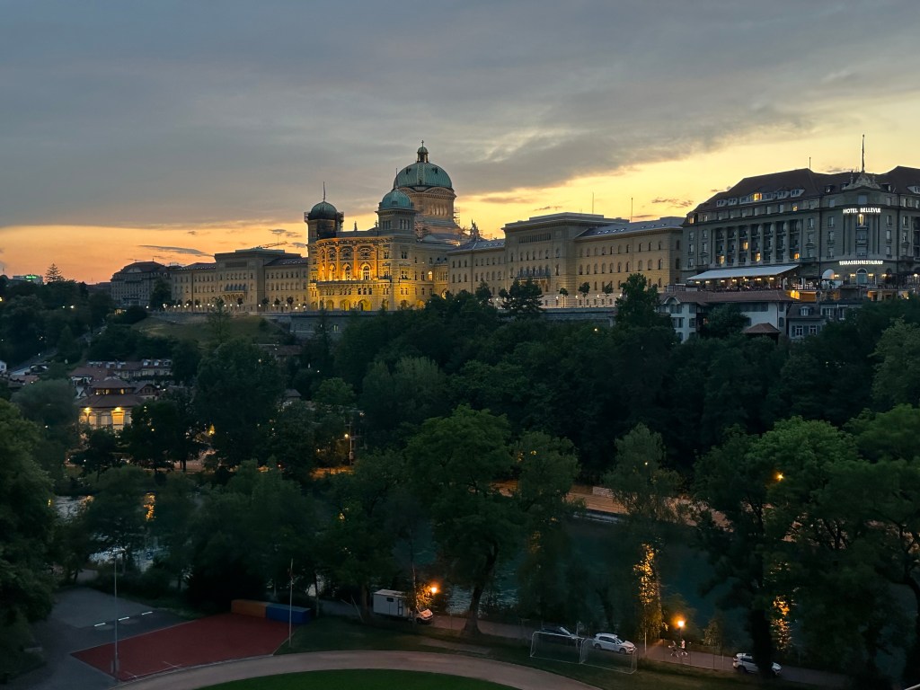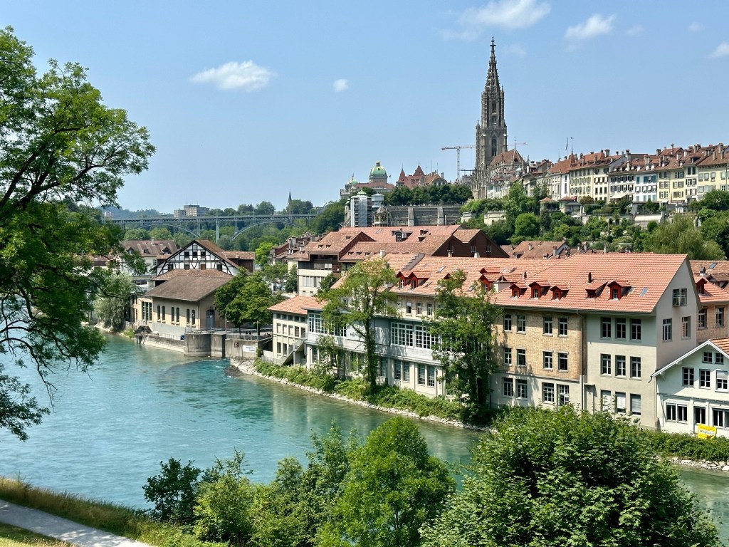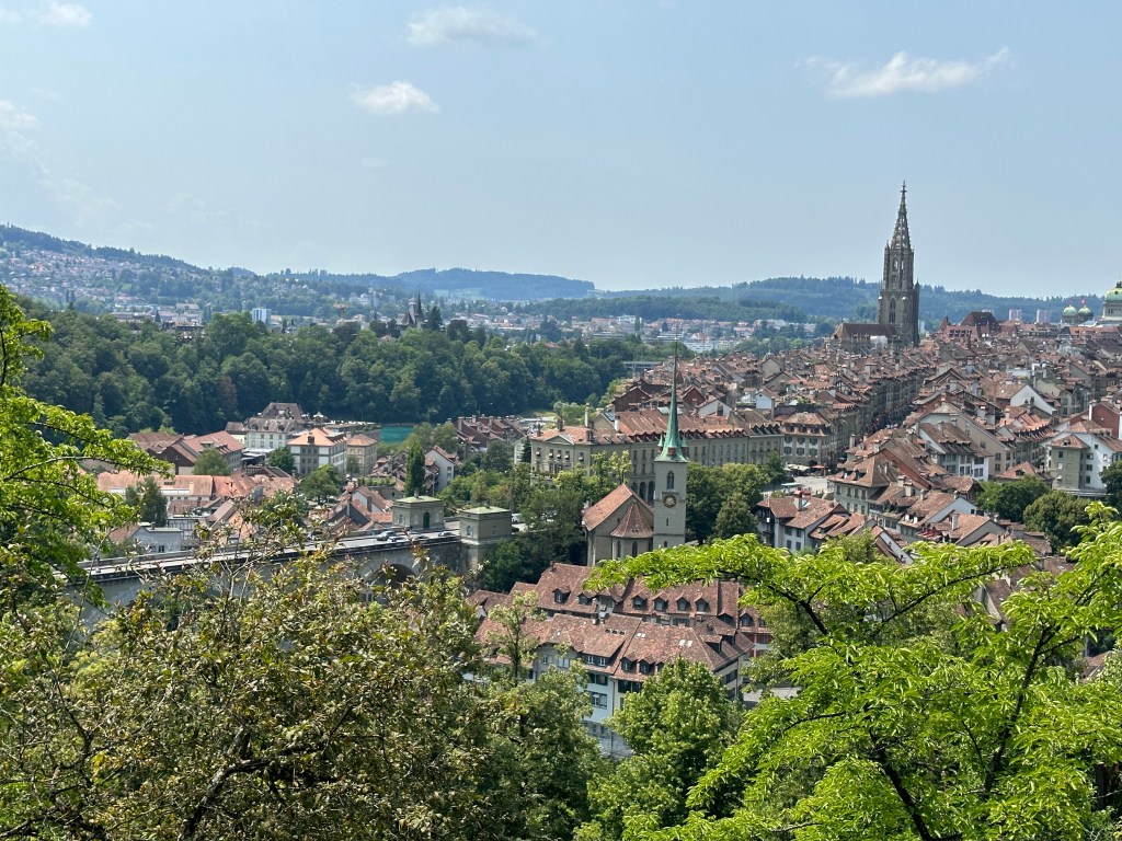 Située à environ 60 minutes de route de Gruyère, la ville de Berne, germanophone, ne manque pas d’atouts. Capitale de la Suisse et chef-lieu du Canton de Berne, elle est inscrite au patrimoine culturel mondial de l’UNESCO, grâce à son patrimoine médiéval urbain qui a pu être préservé au cours des siècles. La ville a été bâtie à l’origine sur une péninsule entourée par la rivière de l’Aar, formant aujourd’hui la vieille ville paisible, pleine de charme, incitant à la contemplation. Notre hôtel étant situé à quelques minutes à pied de la vielle ville, nous avons commencé notre visite par une promenade sur les terrasses, sentiers et jardins offrant de beaux paysages ainsi que des oasis de nature.