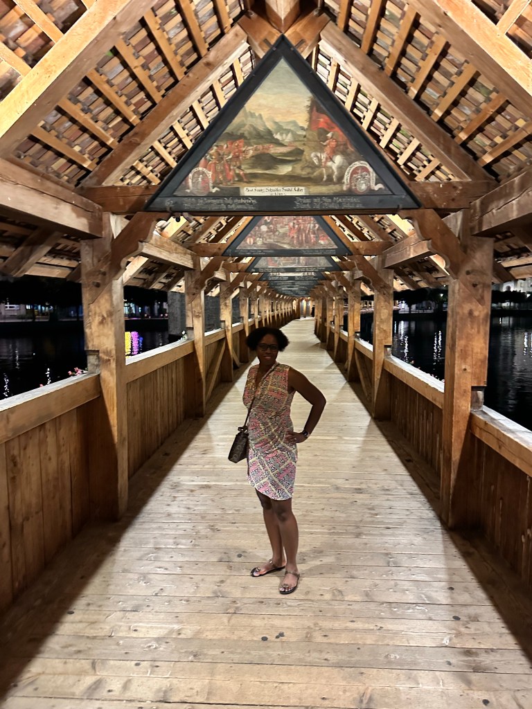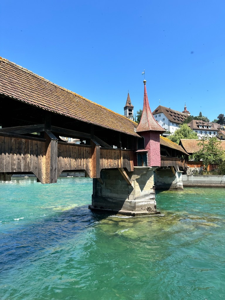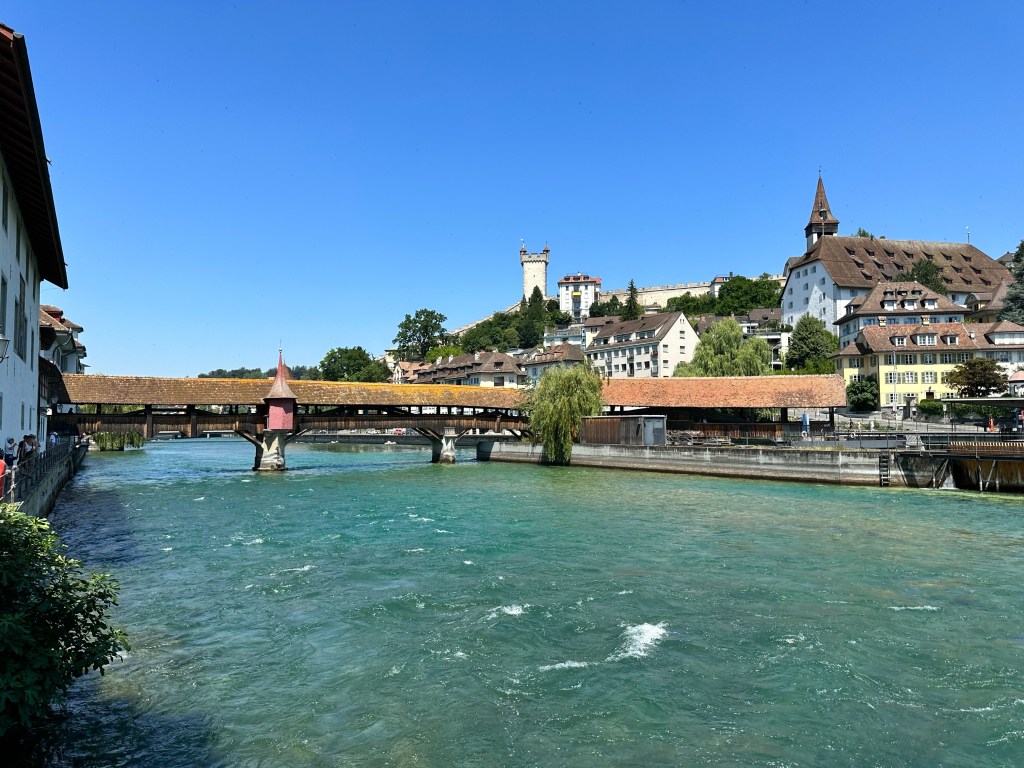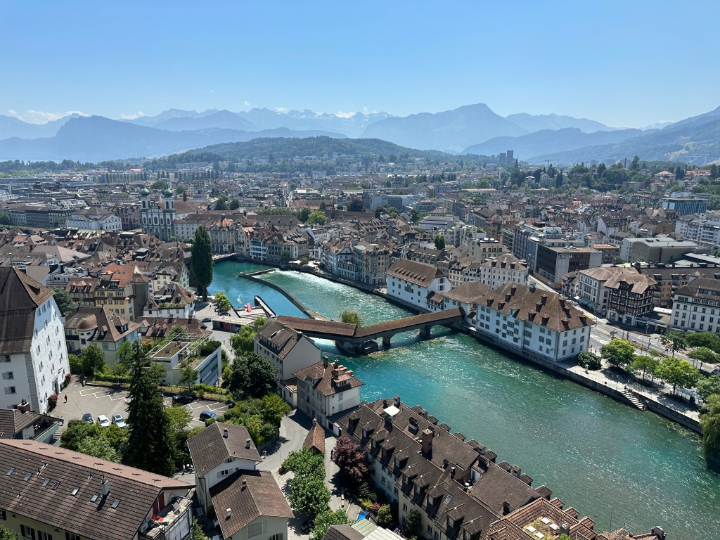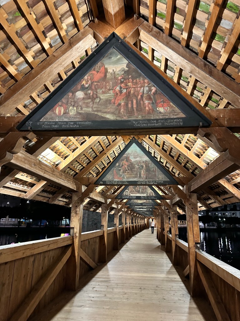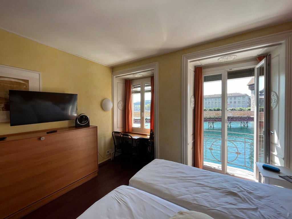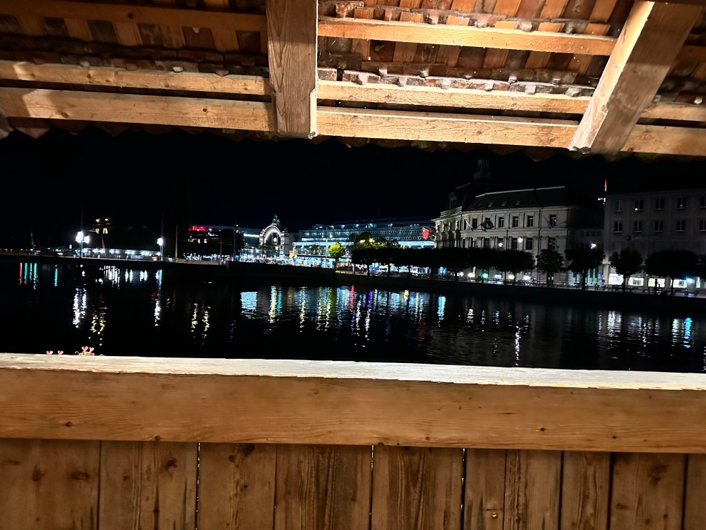 Nous avons réservé un hotel au bord du lac avec vue sur le pont de la Chapelle, l’un des monuments phares de la ville. Ce pont de structure en bois, qui permet de traverser la rivière Reuss (204 m) est le plus ancien et le 2ème plus long pont d’Europe. Notre chambre étant situé au 2ème étage, nous avons une vue plongeante sur ce magnifique pont.