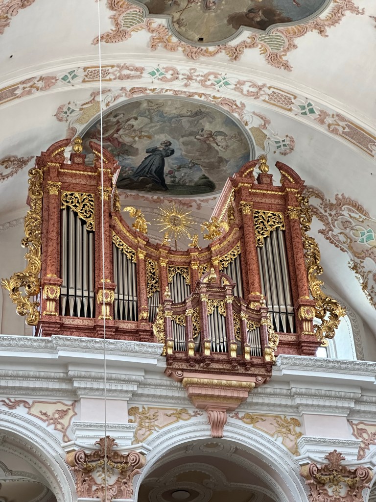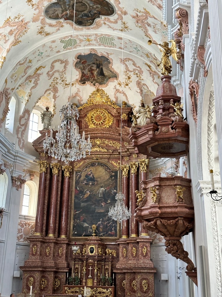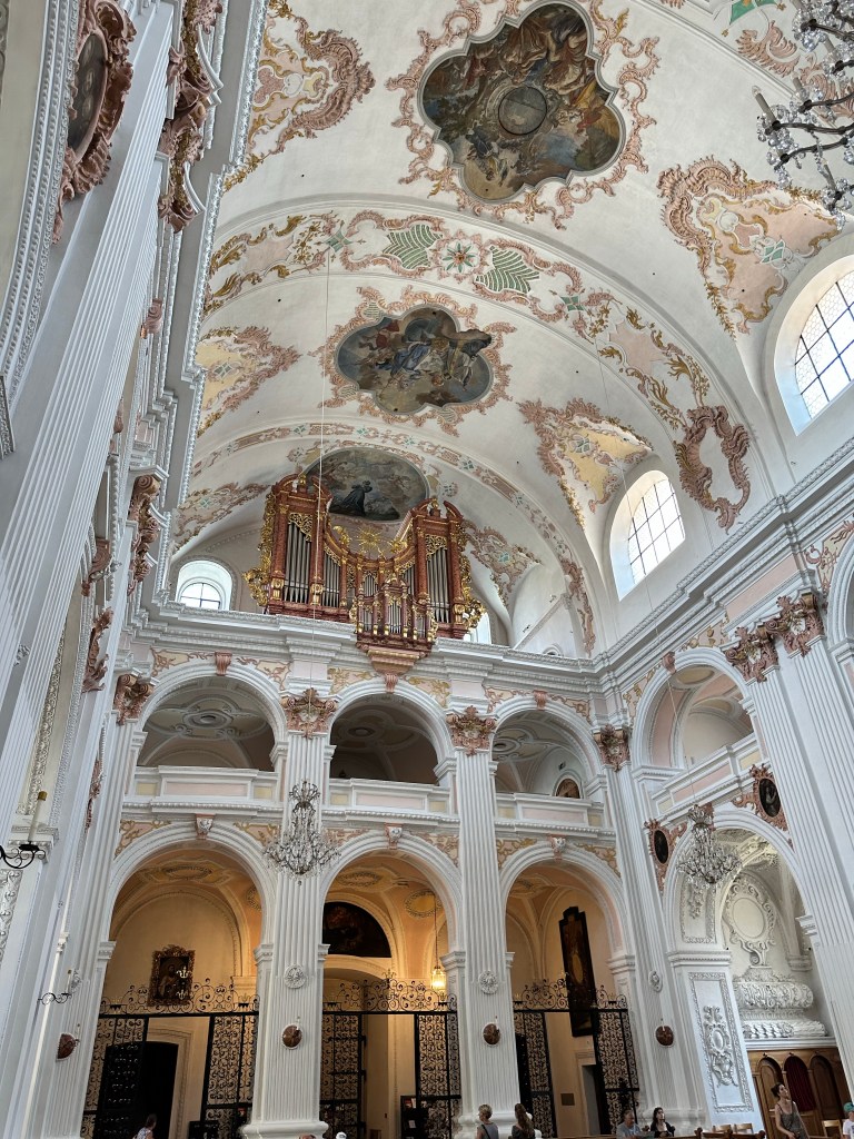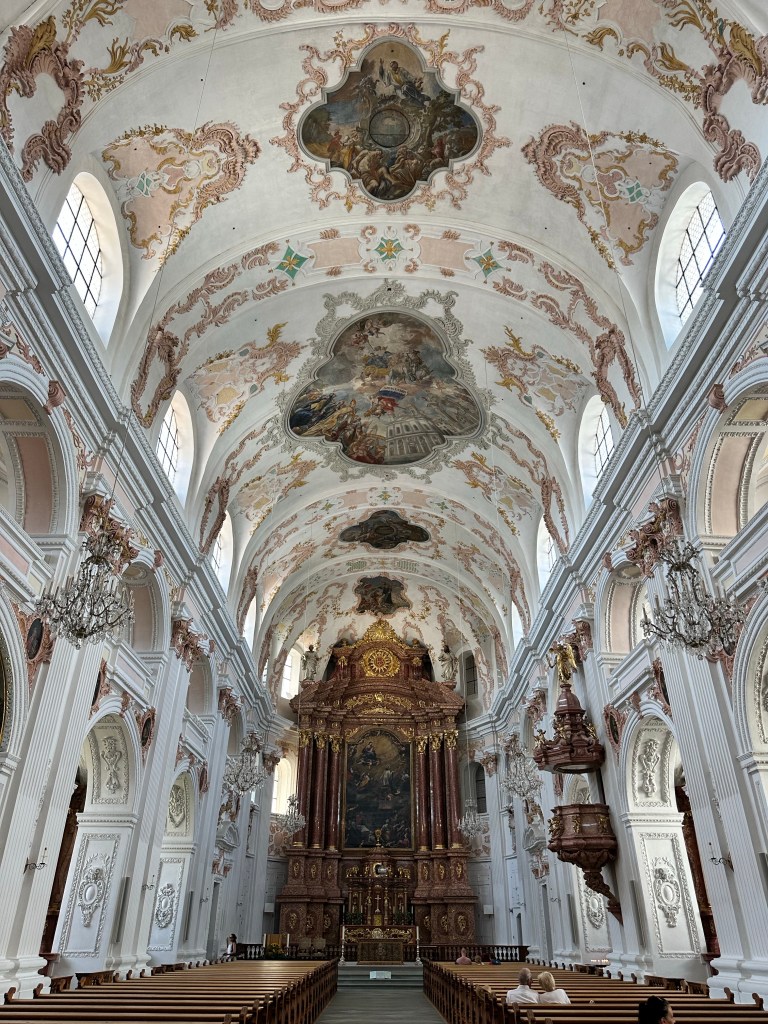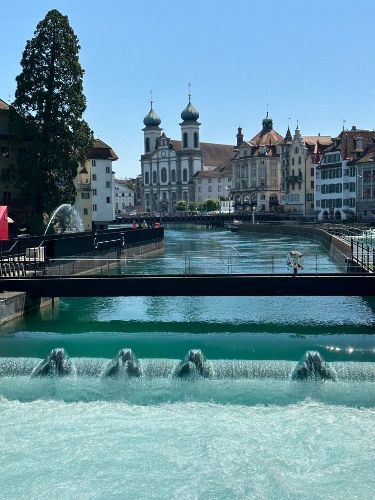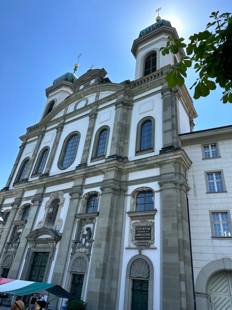 Nous avons commencé notre visite de Lucerne par une promenade à au bord de la rivière reuss après avoir traversé le pont de La Chapelle. Découverte de l’Eglise des Jésuites datant du 17ème siècle, ornée de fresque. L’intérieur est magnifique.