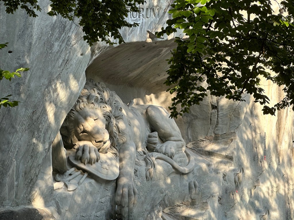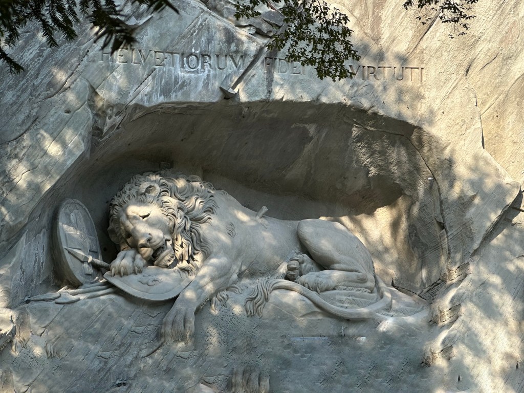 L’après-midi, nous avons visité le musée « jardin des glaciers et le fameux lion de Lucerne, véritable emblème de la ville (qui était en rénovation). Le musée « jardin des glaciers », met en avant les vestiges d’une époque où Lucerne était recouverte de glaciers. Il est constitué d’expositions, de jardin et surtout d’un labyrinthe de miroirs du 19ème siècle (très amusant). Située à quelques pas du musée, la sculpture imposante du lion de Lucerne représente un lion mourant où est inscrit « helvetiorum fidei ac Virtuti » qui se traduit par « à la royauté et à la bravoure des suisses. Il s’agit d’un mémorial qui remémorant la mort des mercenaires suisses qui défendaient le palais des tuileries et le roi de France Louis XVI, lors de l’attaque orchestrés par des révolutionnaires en 1792.
