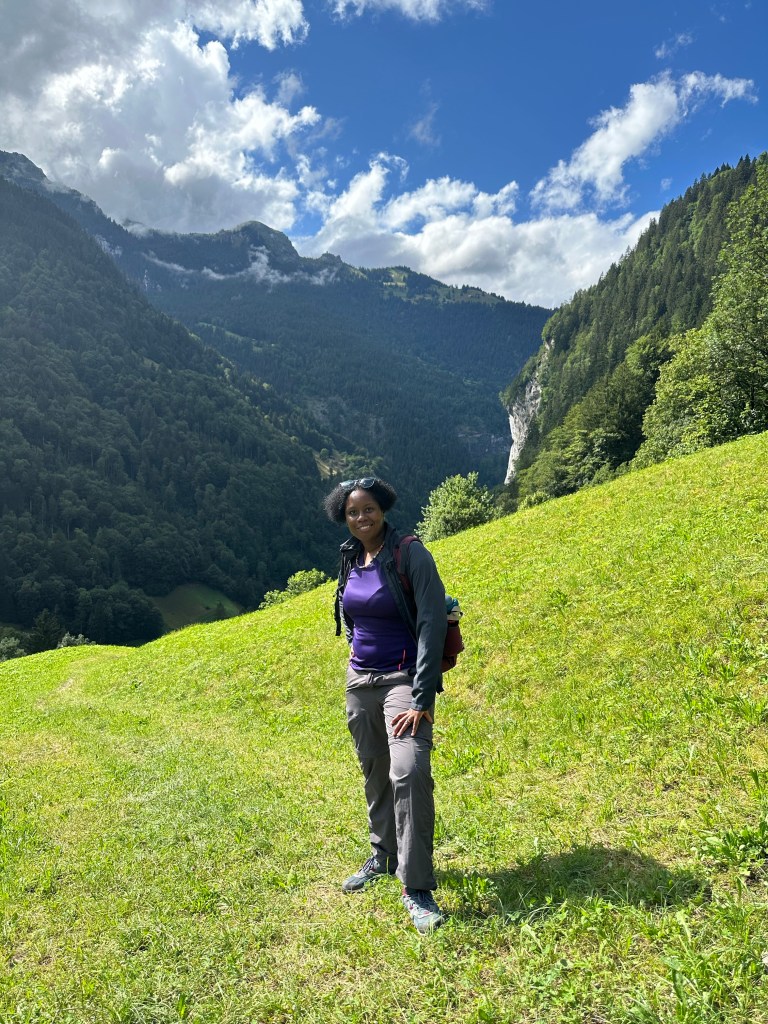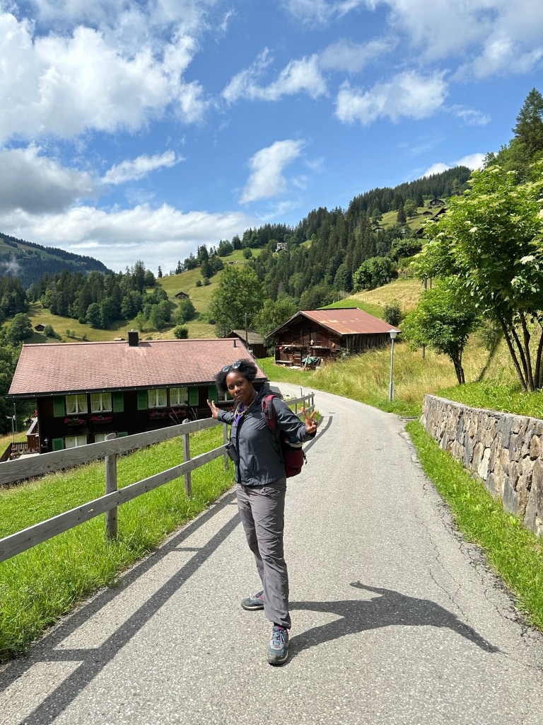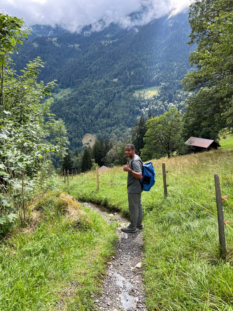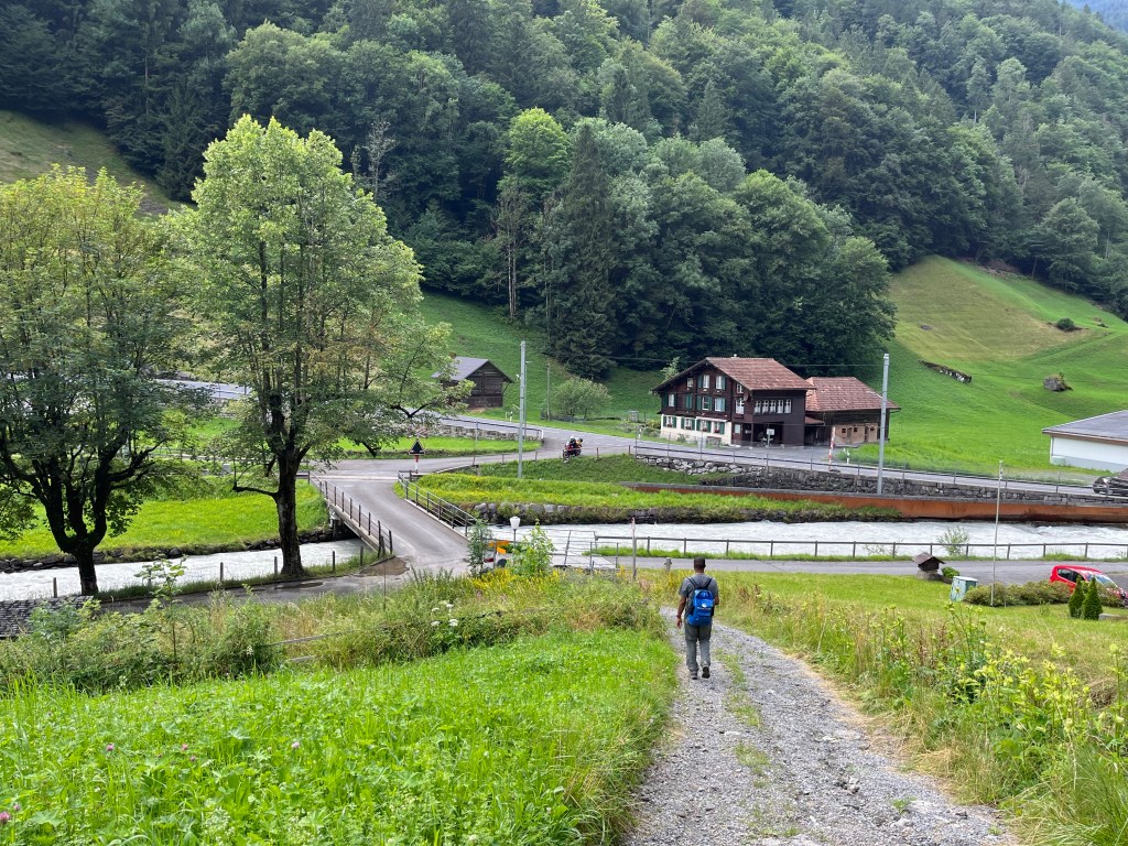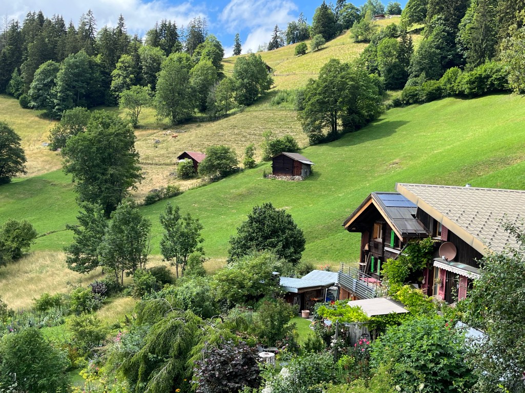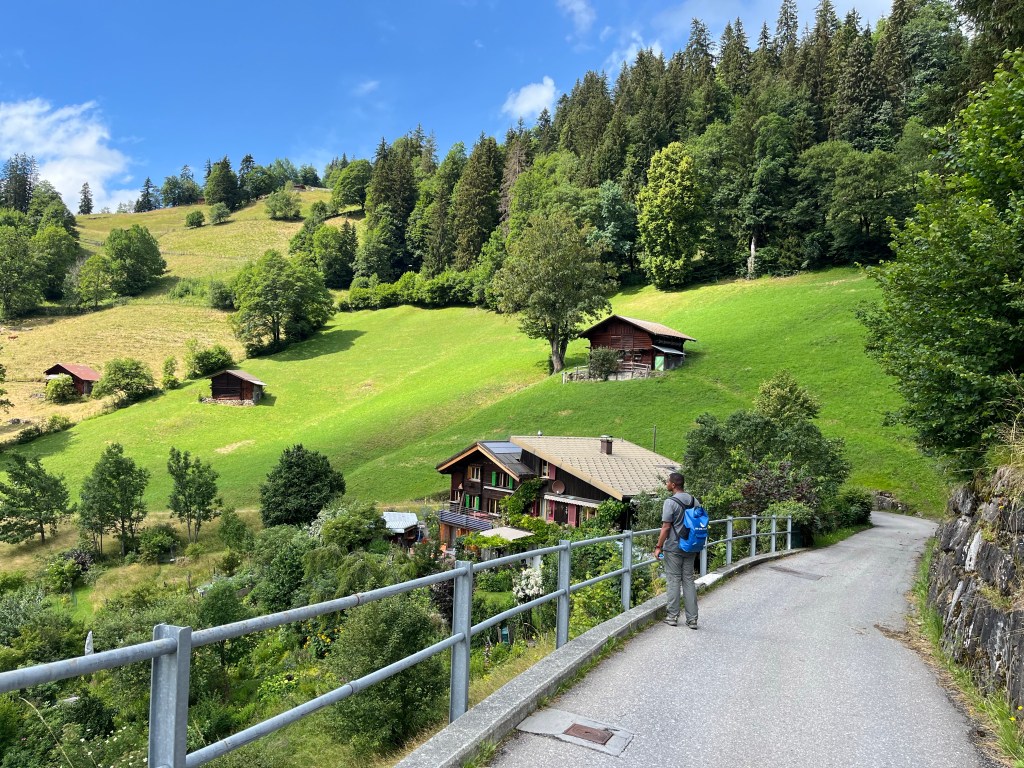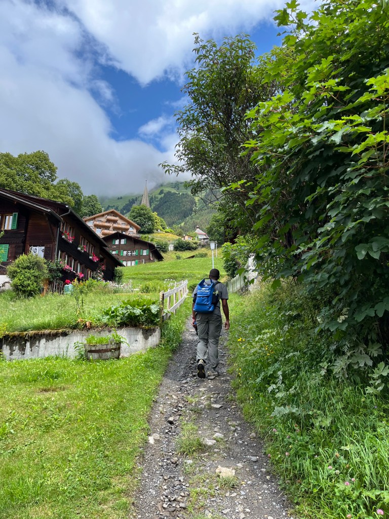 Après avoir fait une pause et visité un peu le village, nous avons entamé notre descente vers Lauterbrunnen par un autre sentier afin de former une boucle. La première partie de la descente vers le village de Wengwald était superbe : pente peu raide avec des maisons et de magnifiques paysages de prairies fleuris.