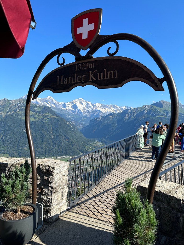 Nous sommes retournés à Interlaken par le bus qui nous a emmené à la station harderbahn. De là, nous avons pris le funiculaire pour harder kulm. Le harder kulm est une petite montagne de Interlaken, à 1323 m d’altitude où se trouve une spectaculaire plateforme qui surplombe les 2 lacs. Cette plateforme sous forme de ponton suspendu dans l’air, offre une vue panoramique, époustouflante, sur la ville d’Interlaken, les sommets alpins environnants et les 2 lacs (Brienz à gauche et Thoune à droite).