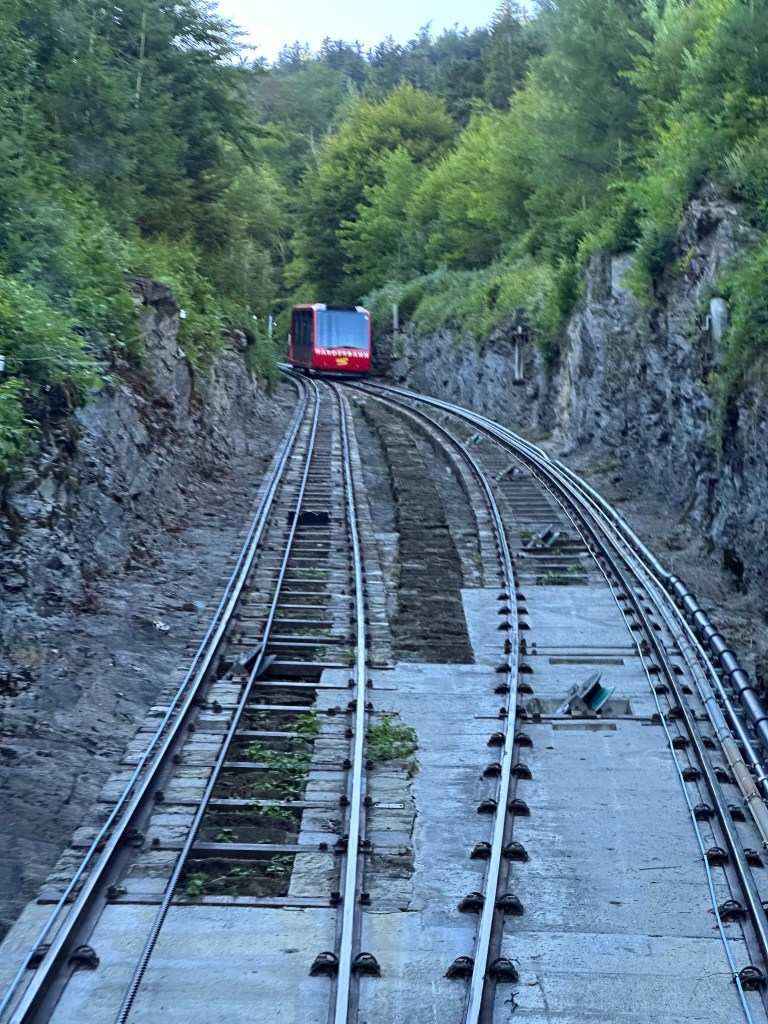 Puis nous avons pris le funiculaire pour remonter jusqu’au Grandhotel. Le funiculaire a été construit en 1879 par un brillant ingénieur suisse Roman Abt qui a mis au point le premier aiguillage à évitement central de l’histoire (rendant obsolète les installations à double voie, bien plus coûteuses, pour tous les funiculaires).