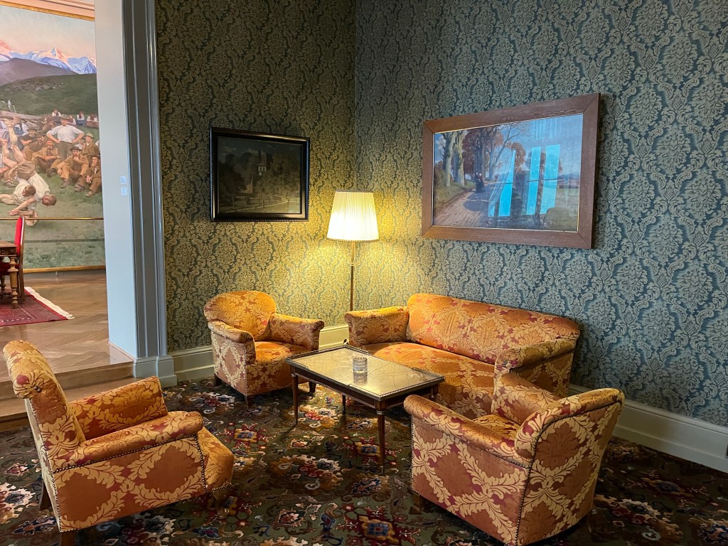 Arrivée au niveau du Grandhotel, avant de rejoindre notre voiture, nous avons profité pour faire une pause et prendre un café dans le château tout en visitant les parties communes (plusieurs petits salons agrémentés de décoration d’époque et de tableaux). La fondation Giessbach au peuple suisse, reconnue d’utilité publique, fut créée en 1983 par Franz Weber afin de préserver le « grand hotel » de la destruction, qui est de la belle époque et d’une grande importance historique, et pour permettre au peuple suisse de conserver ce magnifique joyau du patrimoine national situé sur les hauteurs du lac Brienz.