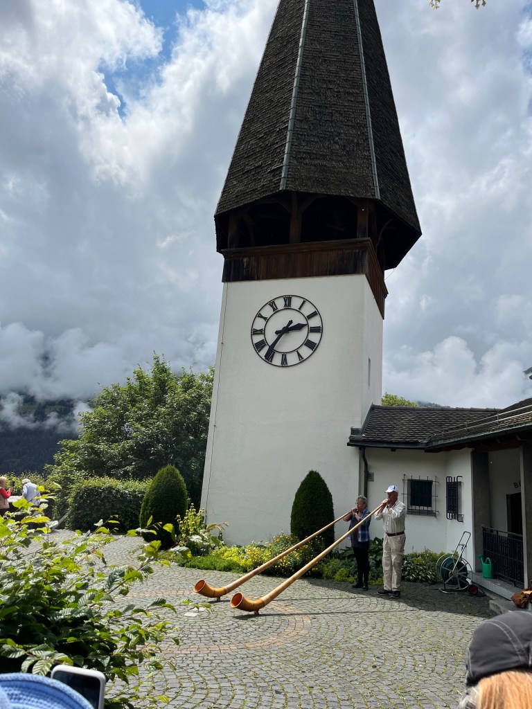 Perché à 1274 m d’altitude, wengen est un village alpin à la fois moderne et traditionnel de l’Overland bernois. On y trouve des boutiques, hotels, restaurants, bars, église et stations… D’ailleurs, on ne peut y accéder qu’en randonnée ou en train de crémaillère, ce qui en fait un lieu sans trafic, bénéficiant d’un air pur de montagne. A peine arrivée dans le village, nous avons été accueillis par le son des célèbres joueurs de cor au pied de l’église.