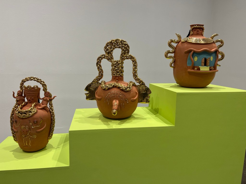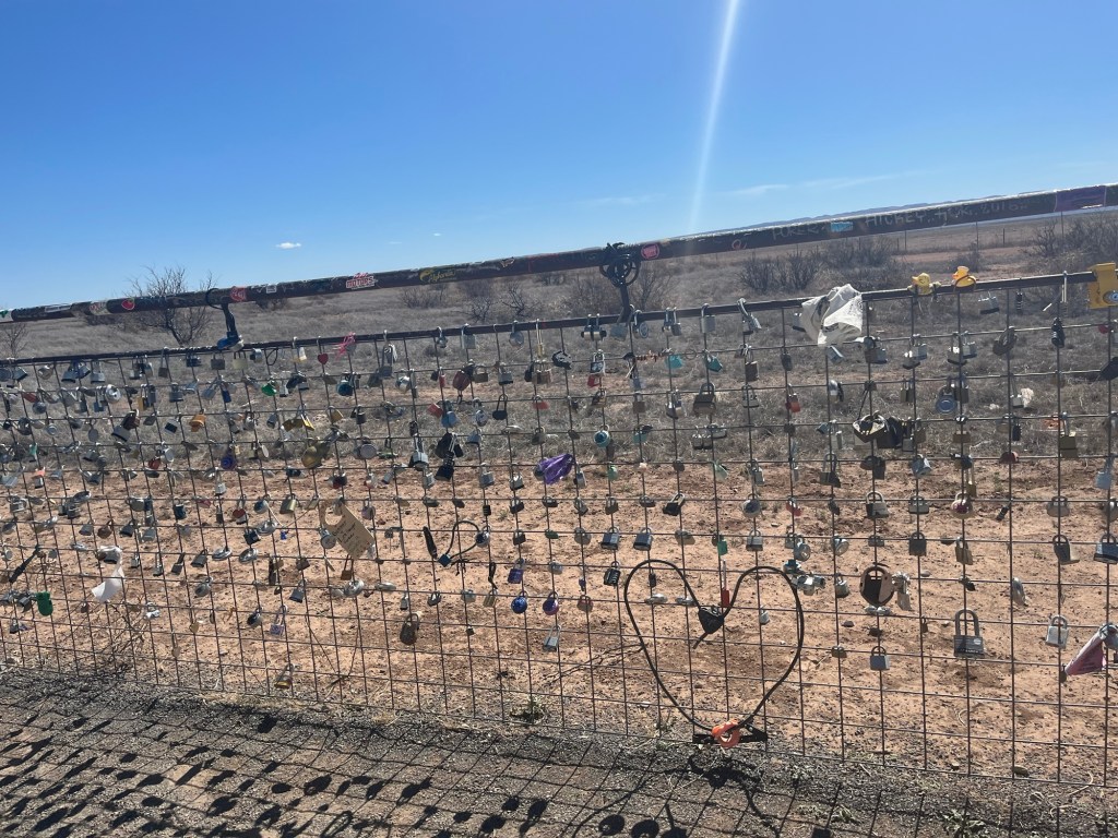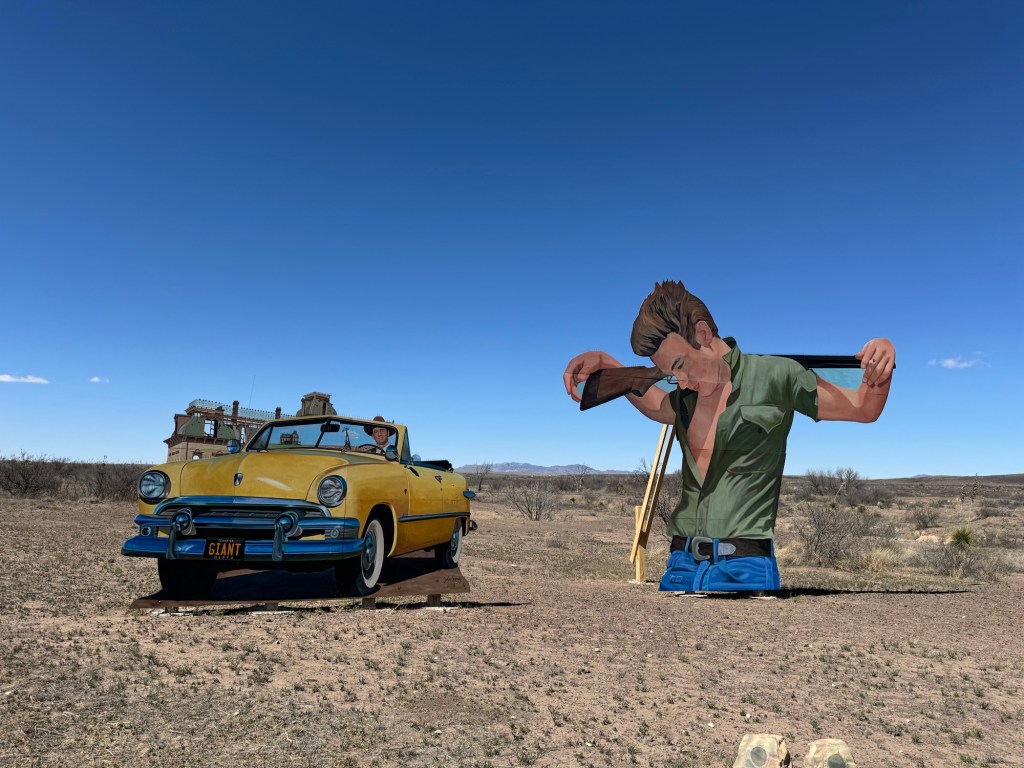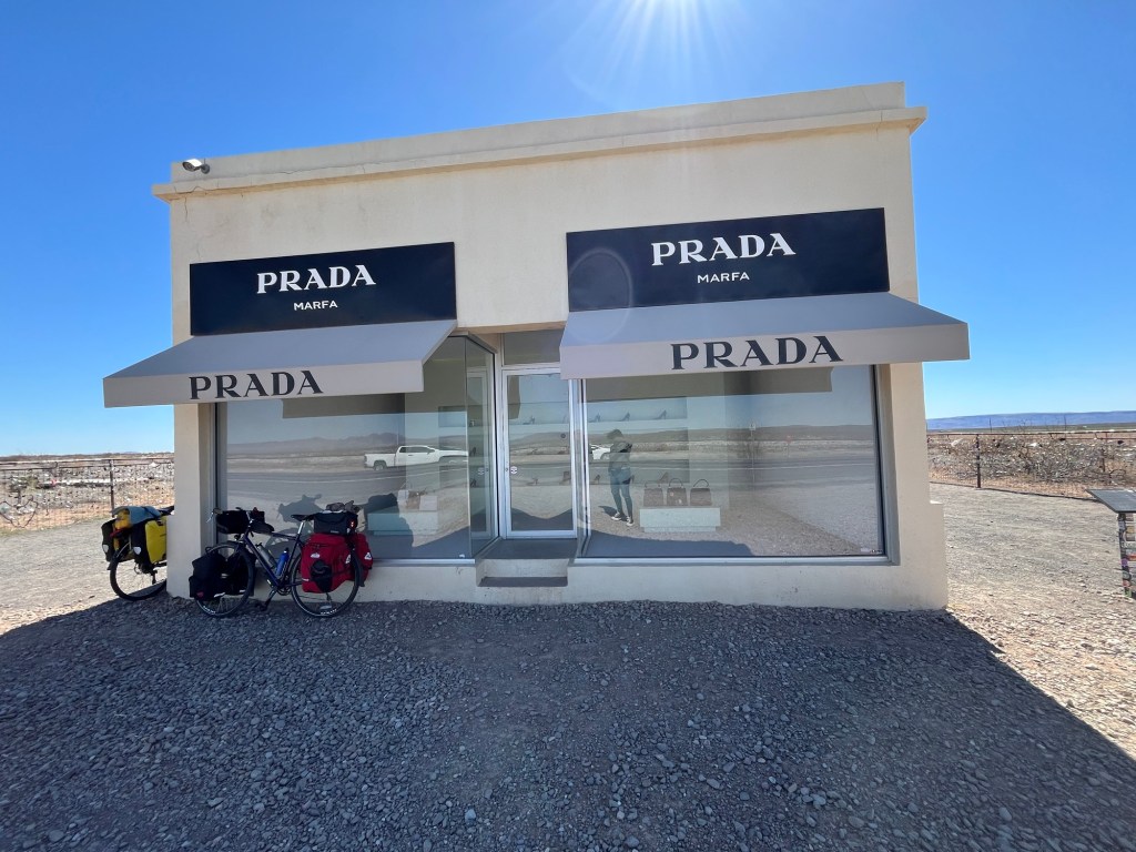 En dehors de la ville, vers l’ouest, sur la route de notre prochaine étape, nous avons pu observer la « Giant Marfa Mural » (grands panneaux découpés en bordure de route représentant certains personnages principaux du film Giant) et l’installation pop-art de Prada Marfa, qui représente une devanture de boutique Prada entourée d’une bordure de cadenas, en plein désert.