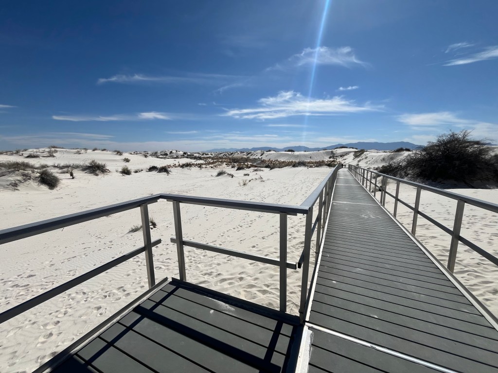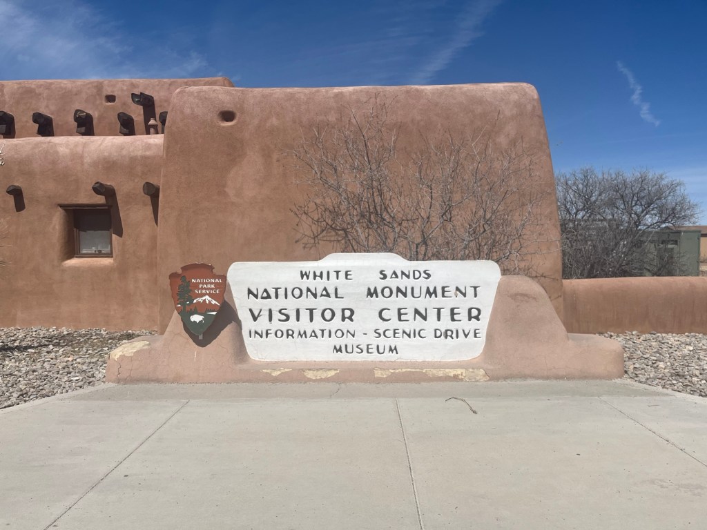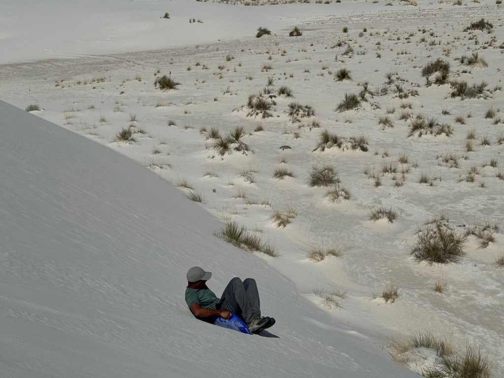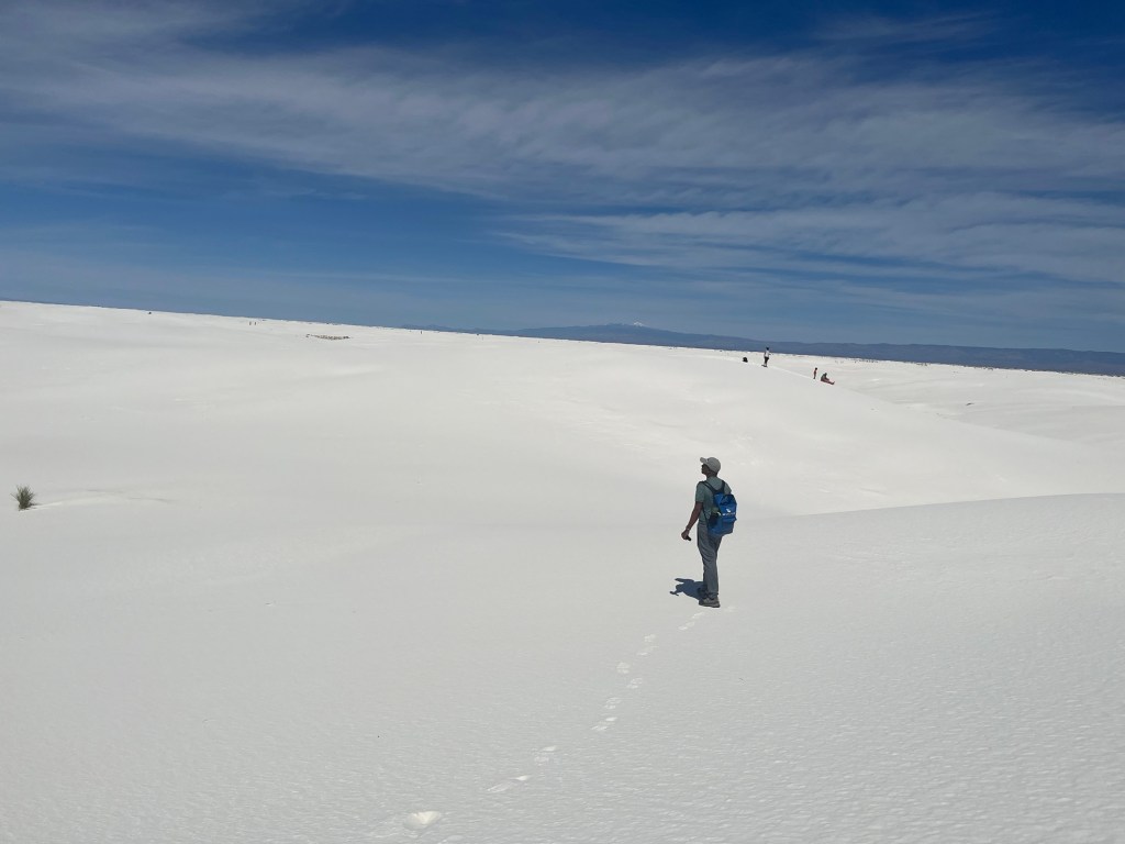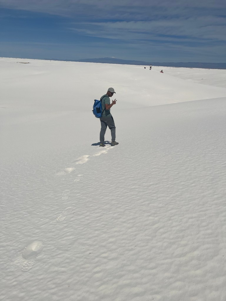 Après un bon petit-déjeuner, nous nous sommes rendus au white Sands National Monument, situé à 1 heure de route de Las Cruces. Le White Sands est un désert de gypse unique au monde. En effet, il est très rare de retrouver le gypse sous forme de sable, le minéral étant soluble dans l’eau. Mais la configuration géographique étant différente dans la région, a permis l’accumulation de gypse sous forme de sable à la surface. Ainsi le désert s’est formé, composé de dunes de sables blancs semblable à de grandes vagues s’élevant à 1200 m d’altitude et réparties sur plus de 700 km2. C’est le plus grand désert de gypse au monde. Pour la visite du parc, il faut se déplacer en voiture vers les différentes zones de randonnées ou de pique-nique. On s’est arrêté au « visitor center », puis au « backcountry camping loop trail » (pour manger, se promener dans les dunes et faire des glissades en luge) et pour terminer à « l’Interdune Boardwalk ».