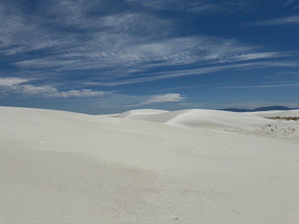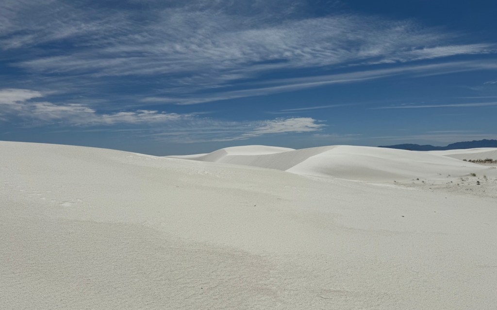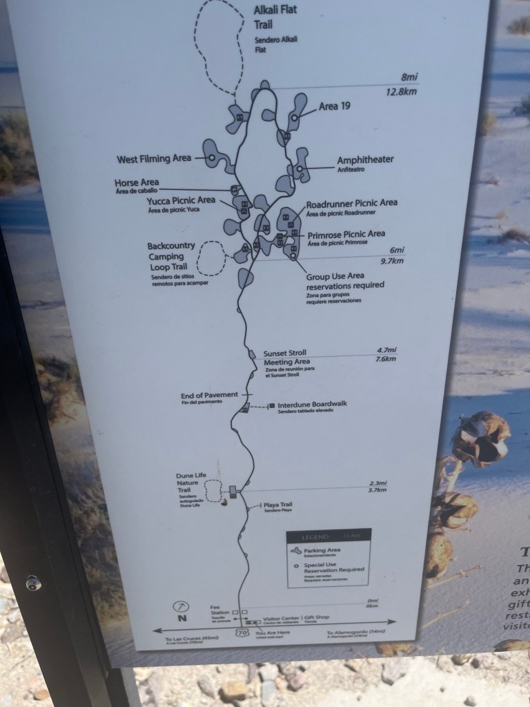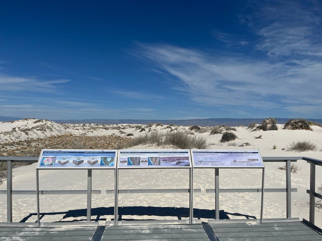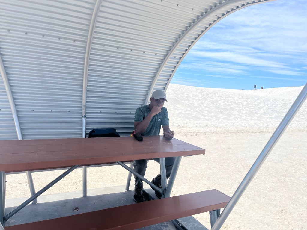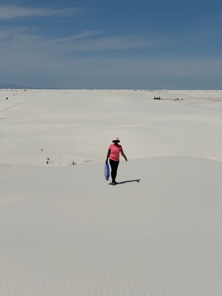 Après un bon petit-déjeuner, nous nous sommes rendus au white Sands National Monument, situé à 1 heure de route de Las Cruces. Le White Sands est un désert de gypse unique au monde. En effet, il est très rare de retrouver le gypse sous forme de sable, le minéral étant soluble dans l’eau. Mais la configuration géographique étant différente dans la région, a permis l’accumulation de gypse sous forme de sable à la surface. Ainsi le désert s’est formé, composé de dunes de sables blancs semblable à de grandes vagues s’élevant à 1200 m d’altitude et réparties sur plus de 700 km2. C’est le plus grand désert de gypse au monde. Pour la visite du parc, il faut se déplacer en voiture vers les différentes zones de randonnées ou de pique-nique. On s’est arrêté au « visitor center », puis au « backcountry camping loop trail » (pour manger, se promener dans les dunes et faire des glissades en luge) et pour terminer à « l’Interdune Boardwalk ».