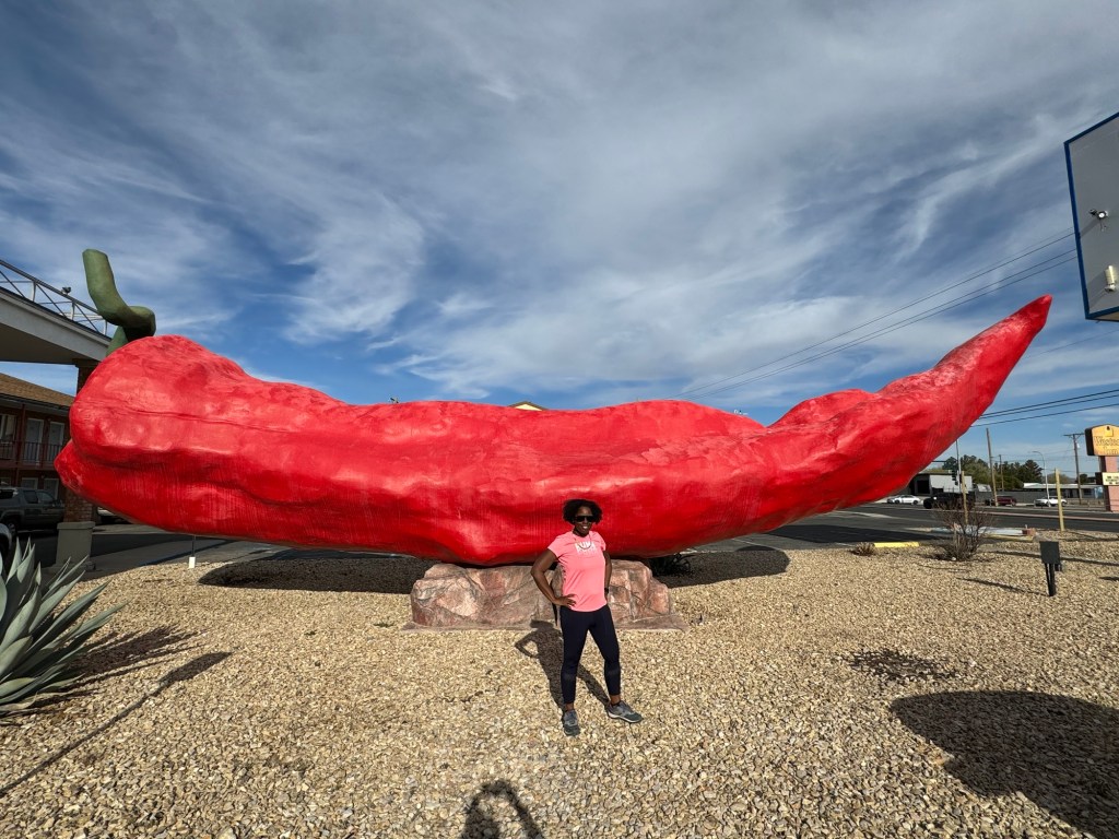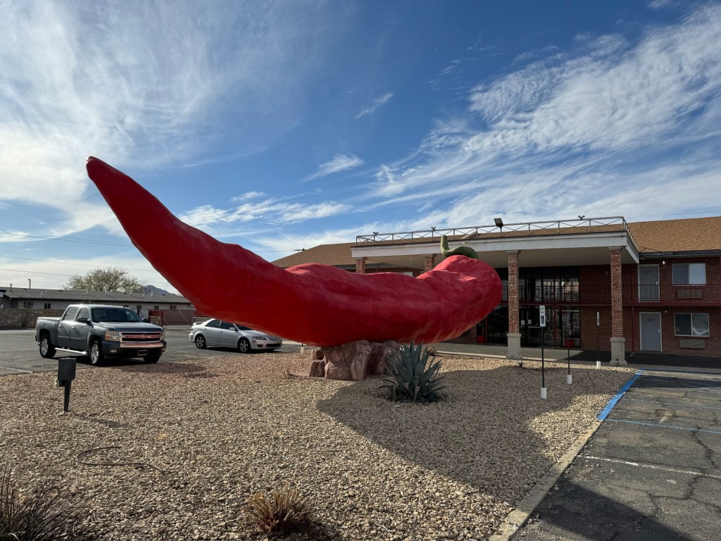 De retour à Las Cruces, on a fait un stop devant la plus grosse réplique de piment rouge du chili, pour faire une photo. Il est situé sur le parking d’un Motel.