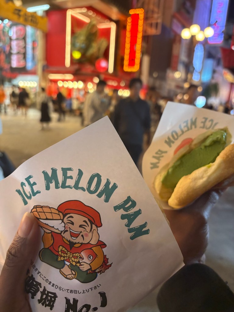 Pour clore cette aventure, nous regagnons le centre d’Osaka et profitons d’une pause gourmande dans un restaurent Izakaya typique, symbolisant l’hospitalité et du raffinement japonais, avant de terminer avec un délicieux melon pan glace matcha.