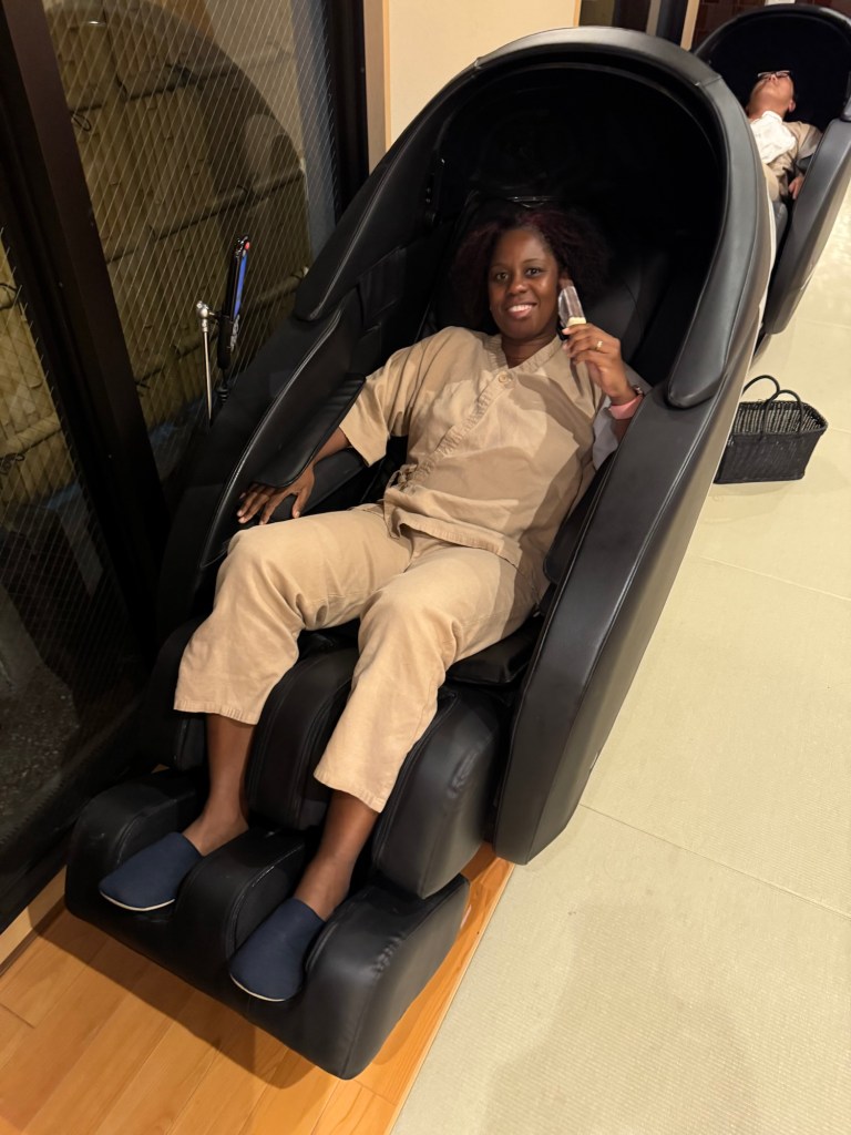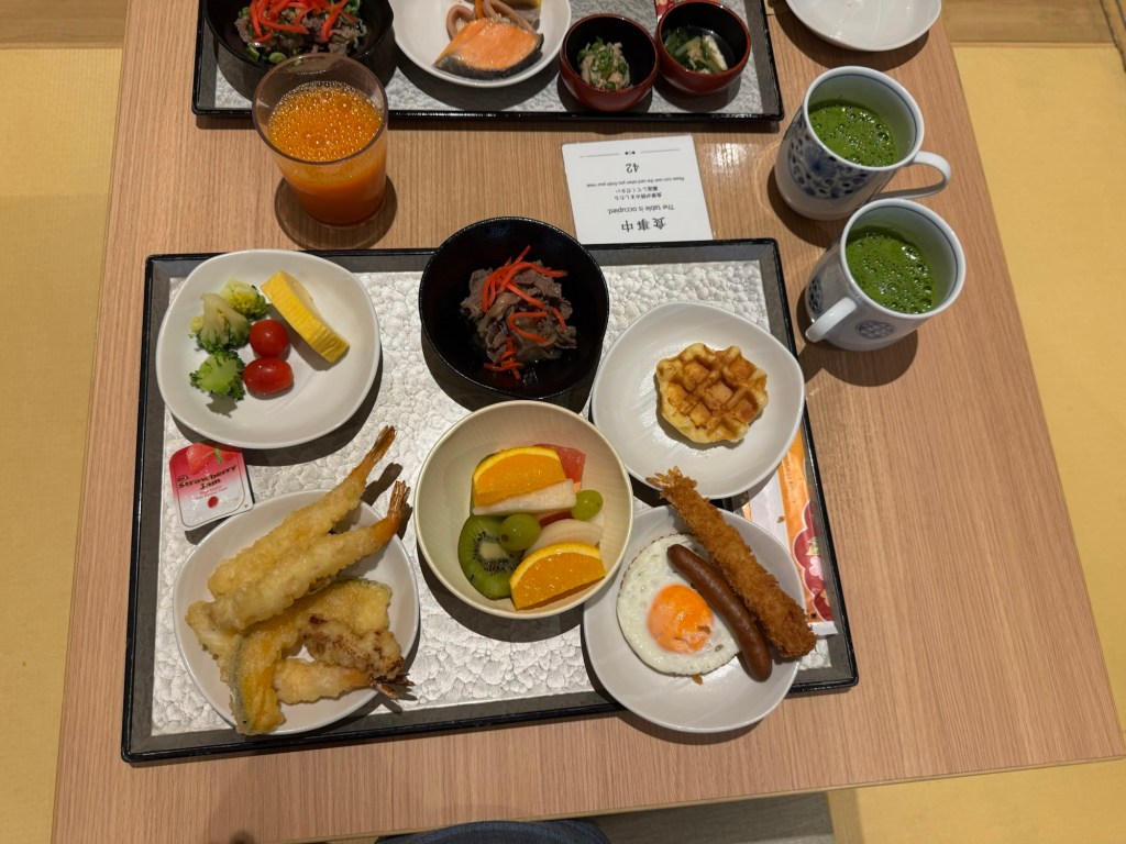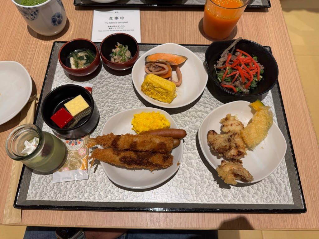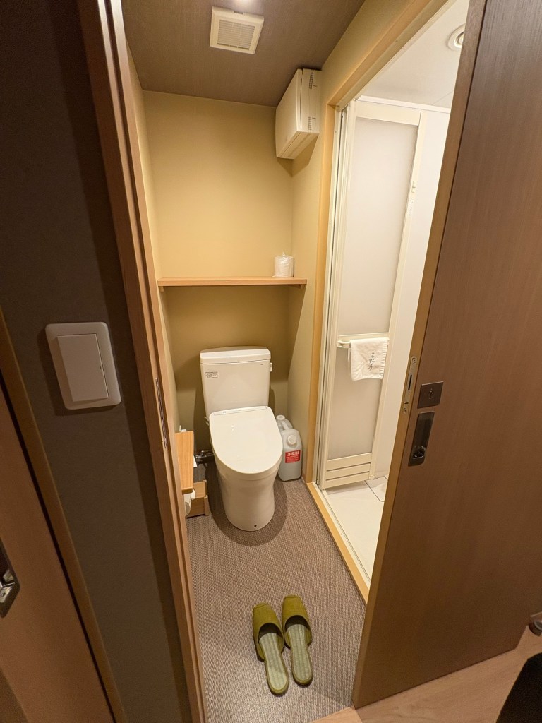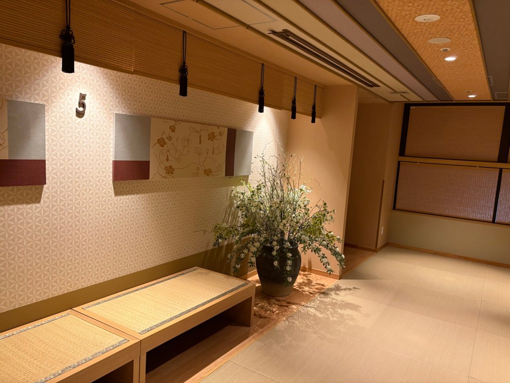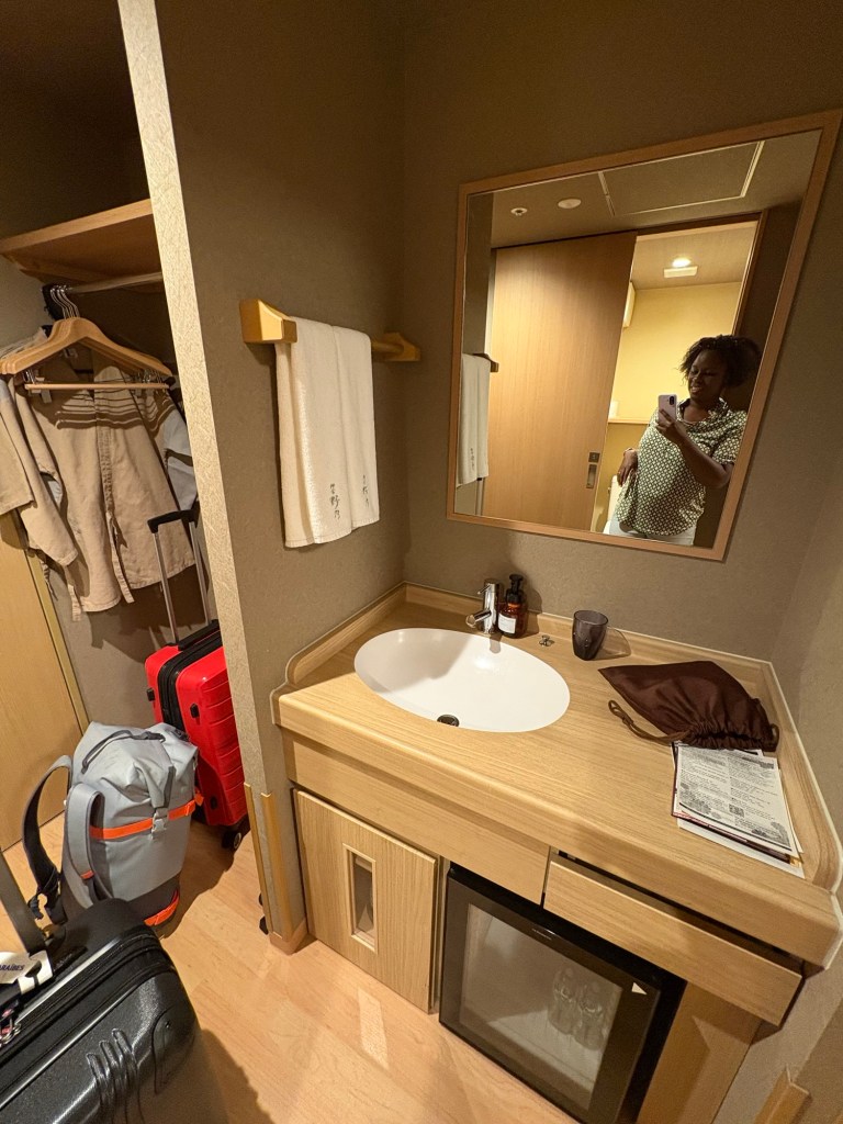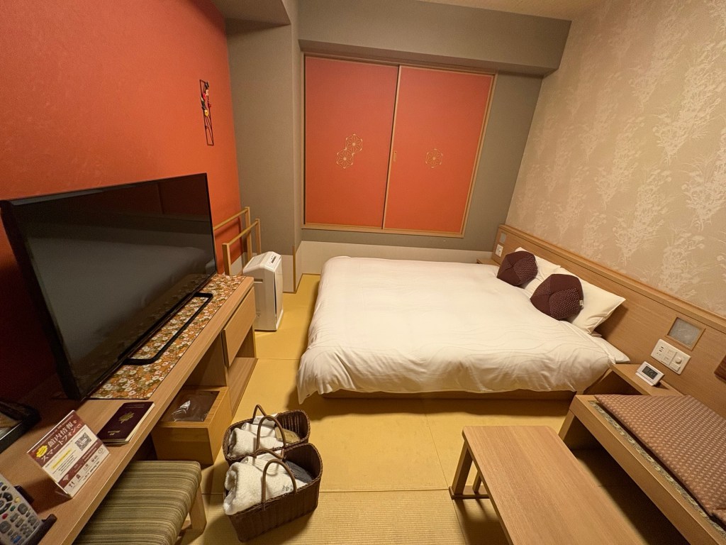 Nous déposons nos bagages dans notre hôtel Onyado Nono Kyotoshichijo situé proche de la gare (environ 7 minutes à pied). Il s’agit d’un grand hôtel entièrement en tatamis dans le style d’un ryokan. C’est une expérience à part entière; dès notre arrivée, on doit se déchausser. La chambre est sympa, petite mais confortable et fonctionnelle. On se balade en pyjama fourni, nu pied ou en chaussettes. Il y a plein de services gratuits comme le petit-déjeuner, les boissons chaudes froides et chaudes (incluant le thé matcha), des glaces, des ramens le soir, des fauteuils massants et surtout un superbe onsen avec plusieurs bassins différents, idéal pour des moments de détente.