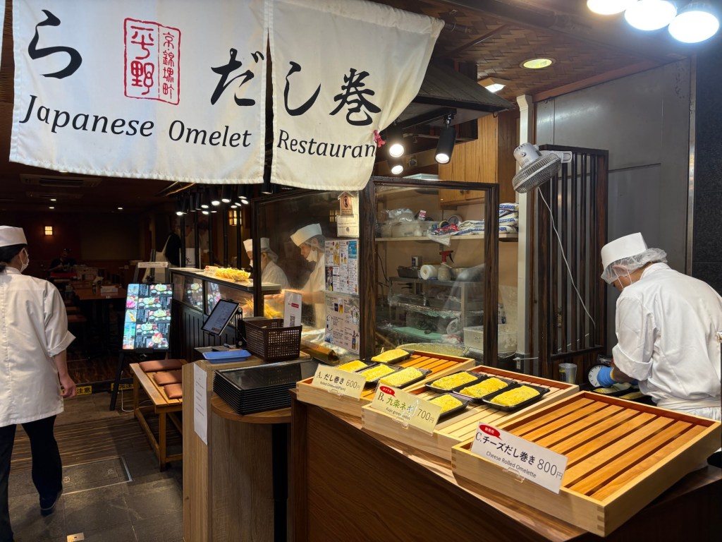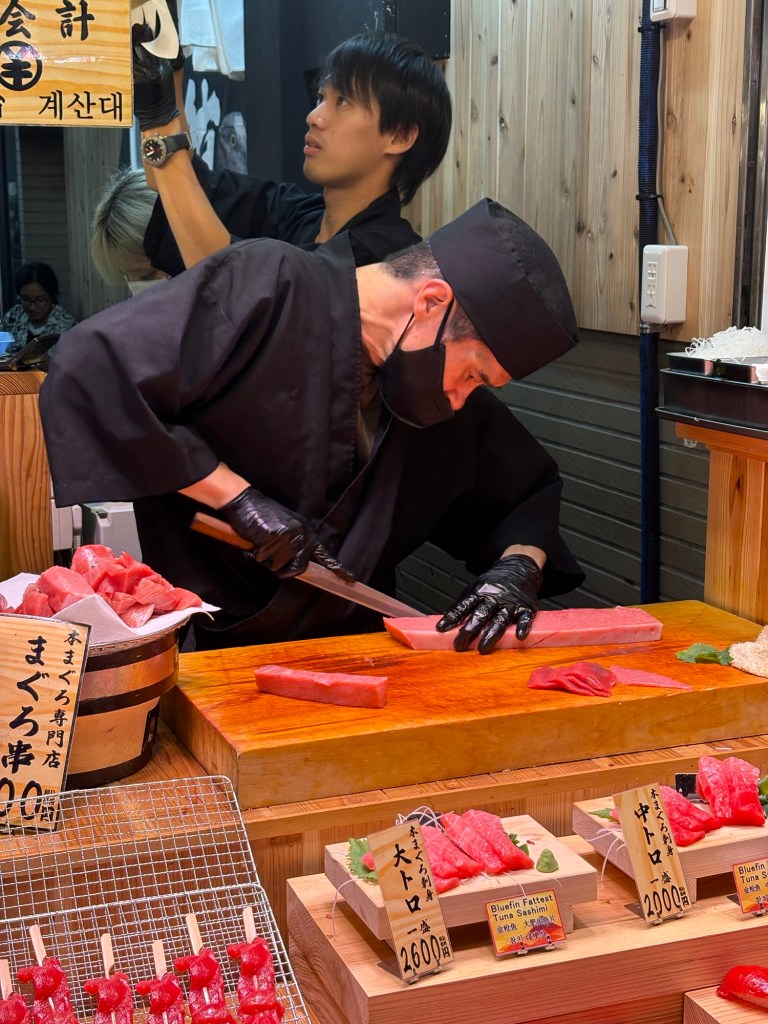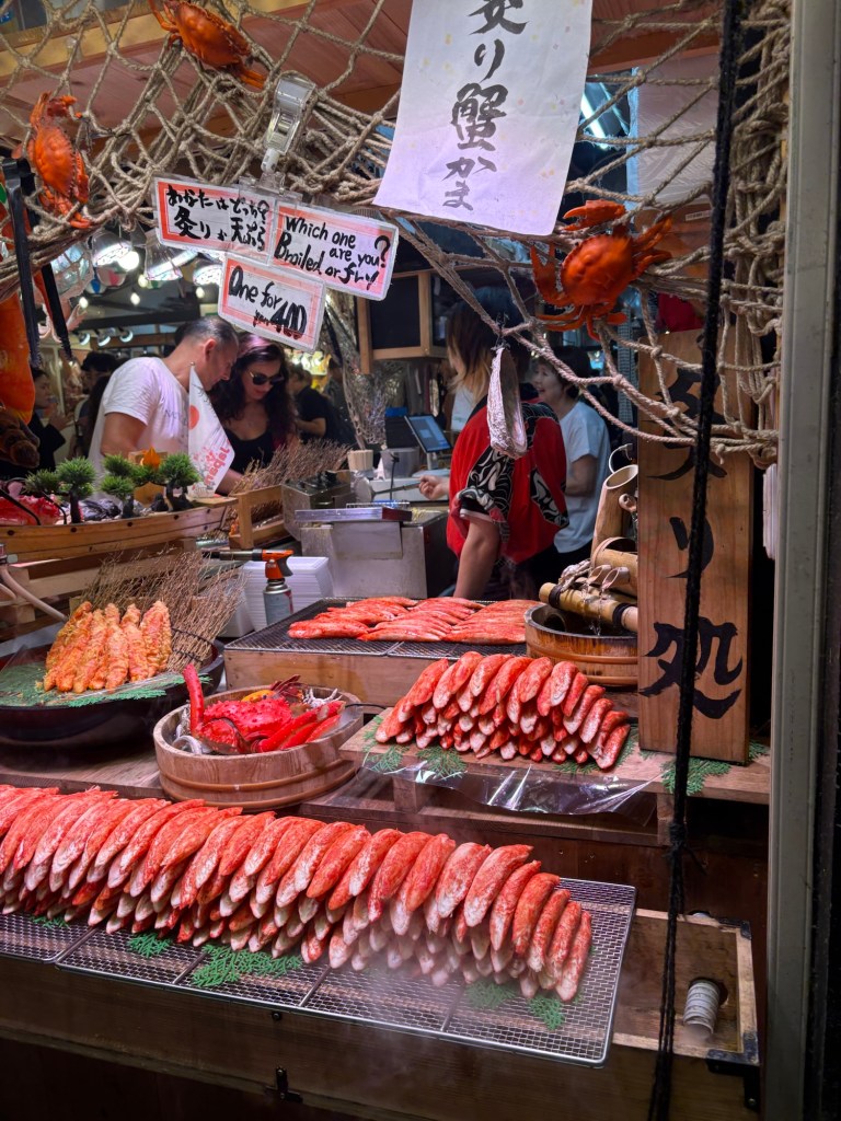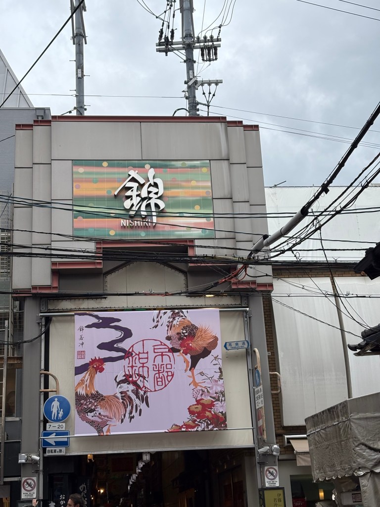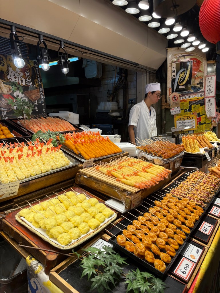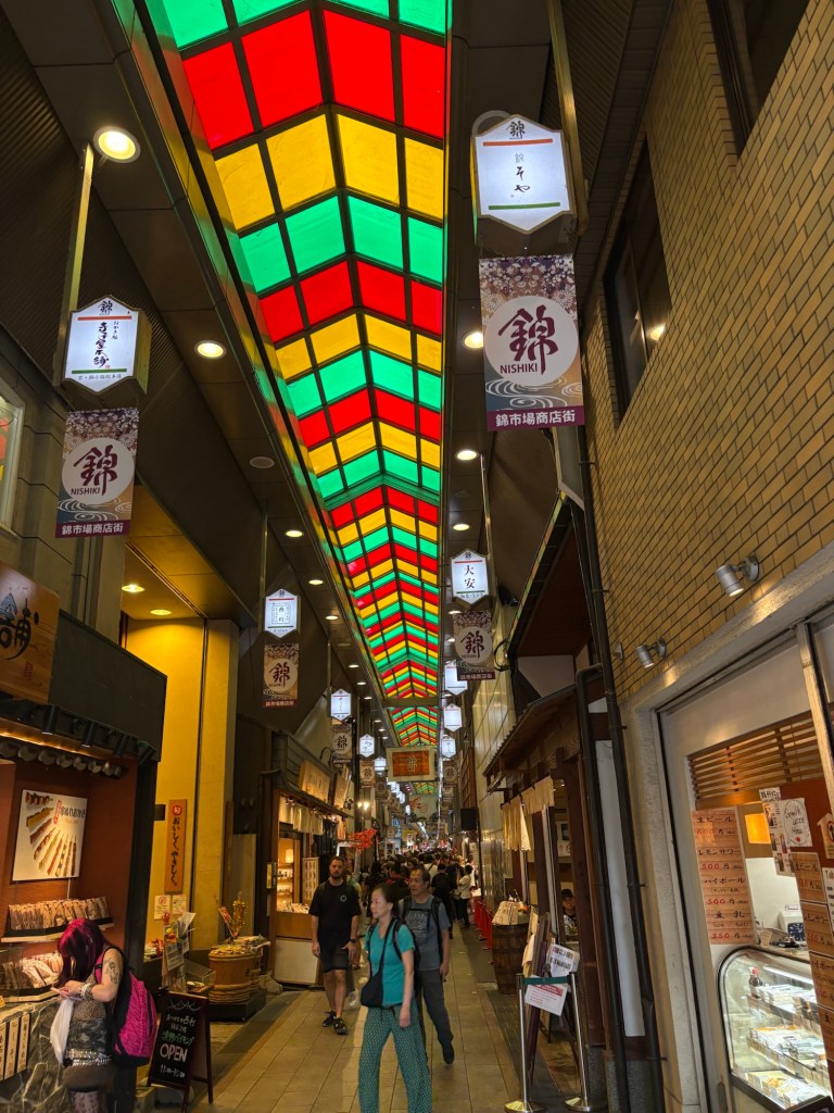De retour à Kyoto, nous reprenons le rythme citadin avec la redécouverte du marché Nishiki (déjà visité en 2019), un passage couvert rempli de couleurs, d’odeurs et de spécialités locales. Entre poissons séchés, épices, douceurs au matcha et souvenirs artisanaux, c’est un véritable festival pour les sens ! Nous profitons pour y déjeuner (délicieux sushimis et anguilles).