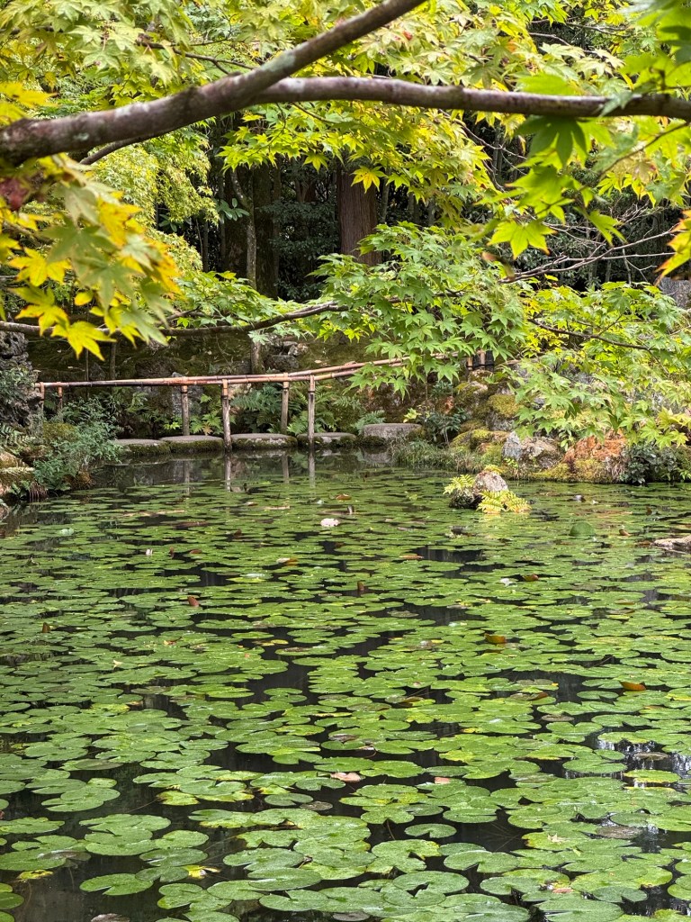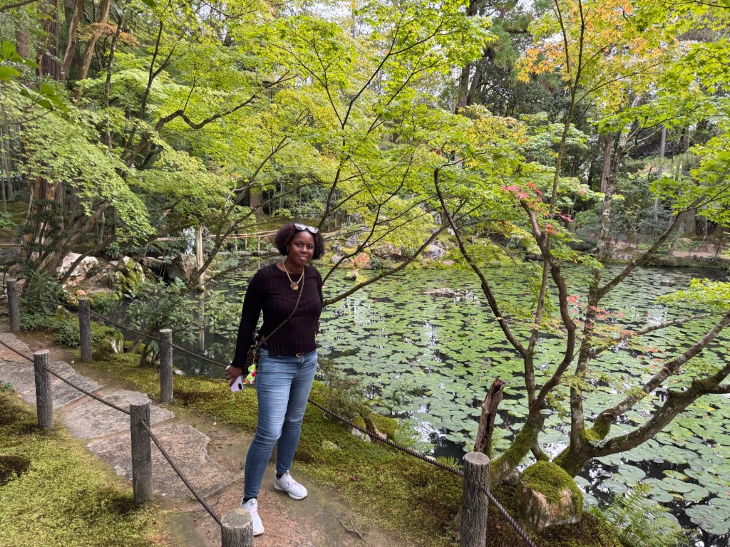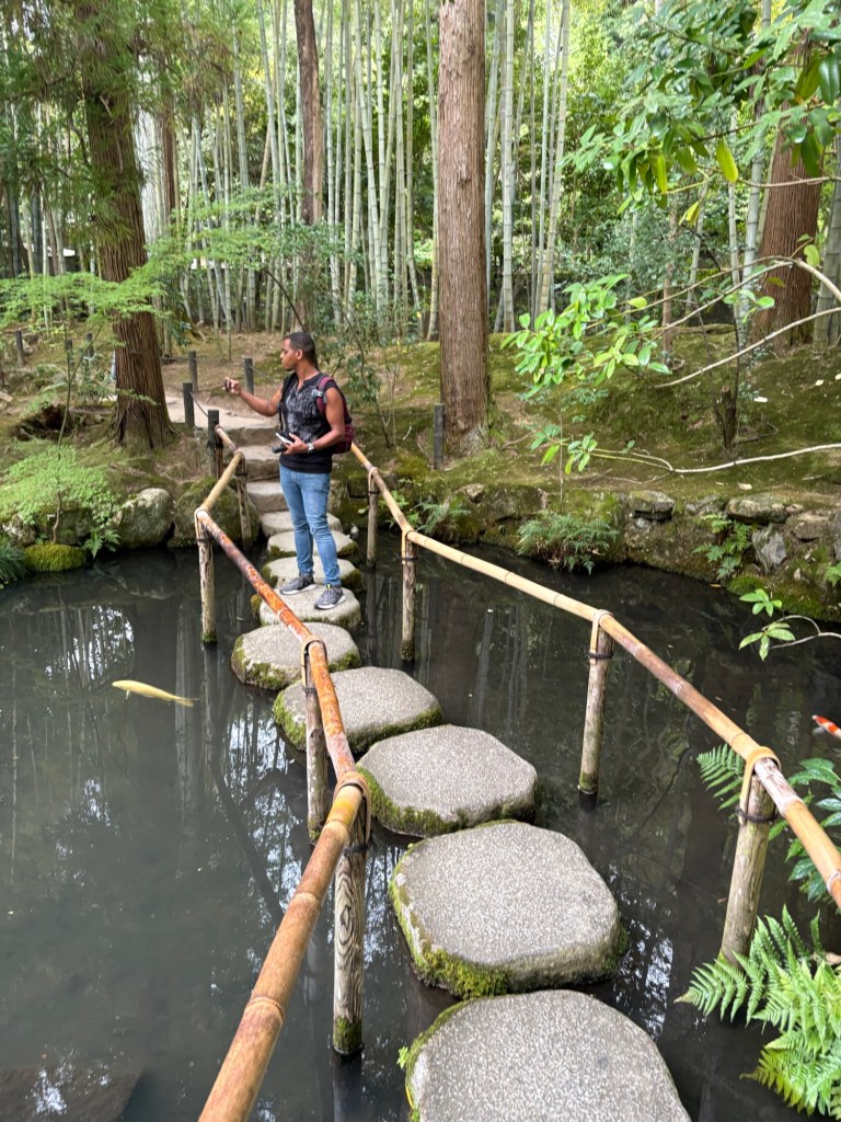 Pour notre première journée à Kyoto, nous voulons absolument revoir le Kinkaku-ji. Ce temple emblématique, plus connu sous le nom de Pavillon d’Or est recouvert de feuilles d’or et se reflète avec grâce sur l’étang qui l’entoure. Le lieu dégage une atmosphère presque irréelle. Le silence, interrompu seulement par le chant des oiseaux, invite naturellement à la contemplation.