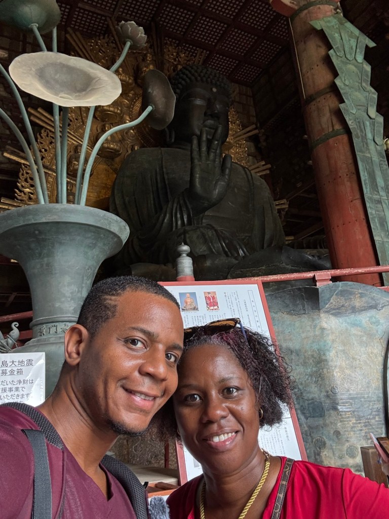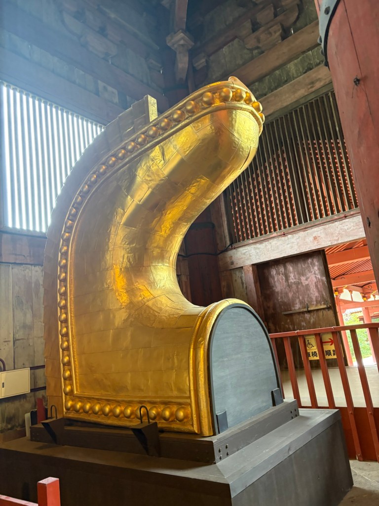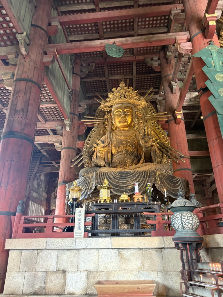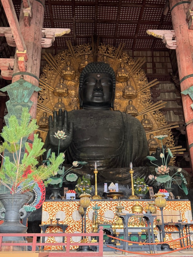 Puis, place à l’incontournable temple Tōdai-ji, qui abrite un Bouddha de bronze géant, l’un des plus imposants au monde. À l’intérieur, l’atmosphère est à la fois solennelle et apaisante ; on se sent tout petit face à cette statue majestueuse et à l’immense structure en bois du Daibutsu-den, le plus grand bâtiment en bois jamais construit.