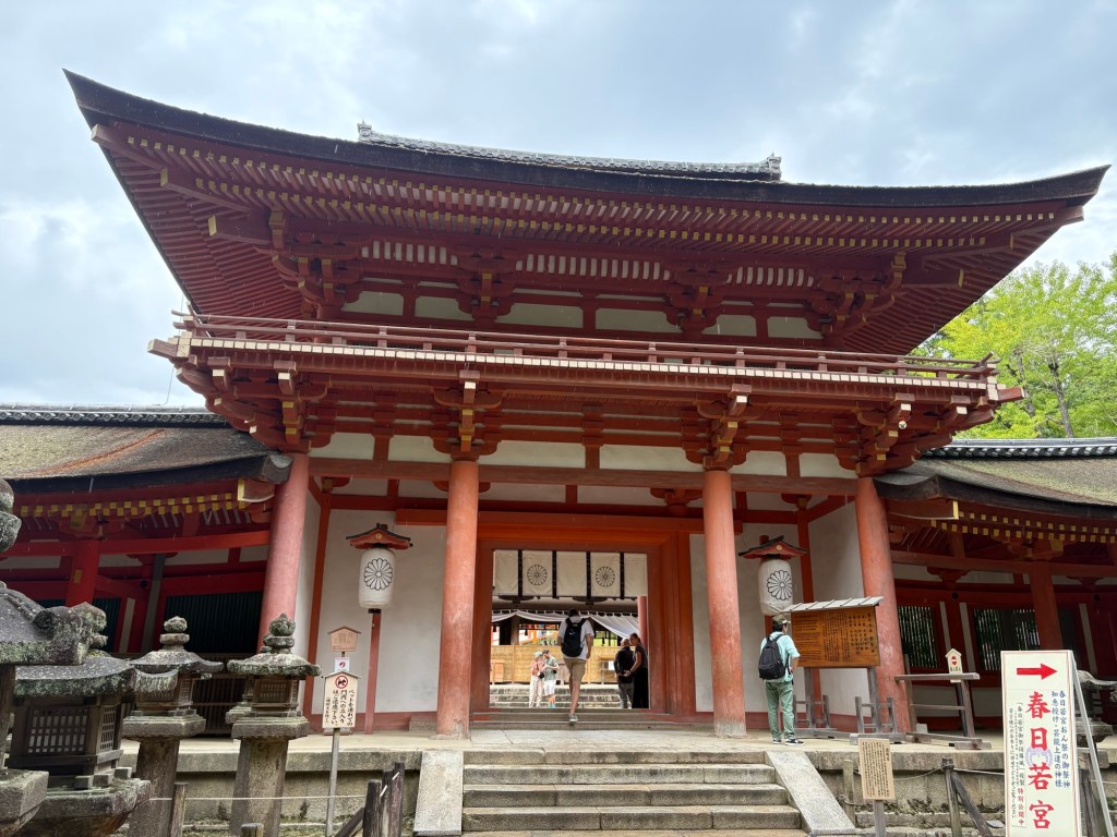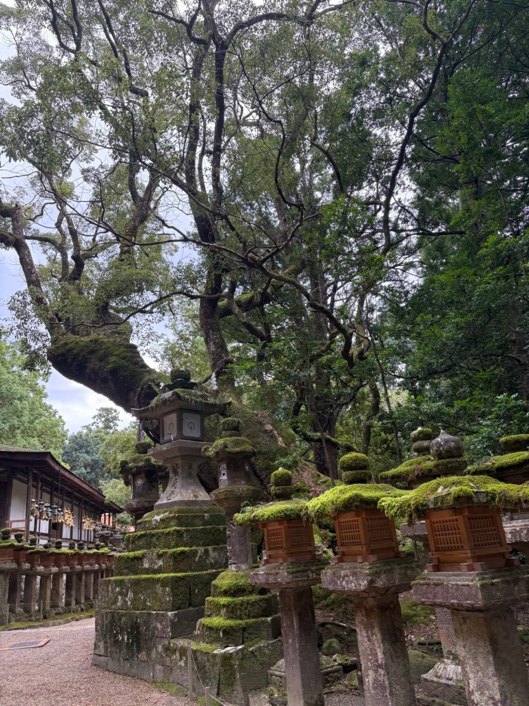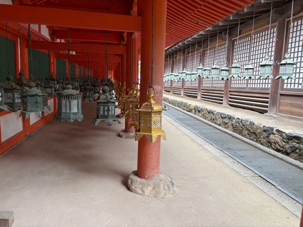 Le dernier temple visité à Nara est le sanctuaire Kasuga Taisha, célèbre pour ses milliers de lanternes de pierre et de bronze alignées dans la forêt. Ce sanctuaire shinto, enveloppé d’une lumière douce et d’une végétation luxuriante, semble tout droit sorti d’un rêve.