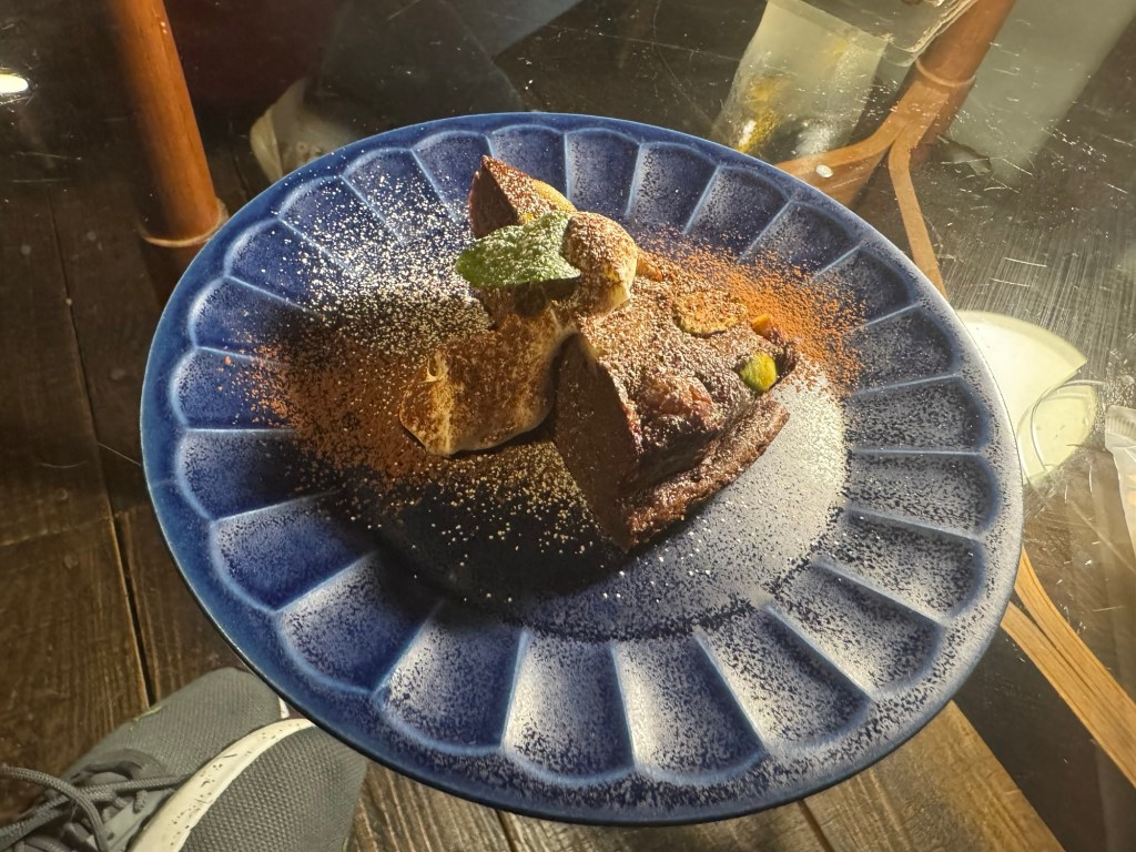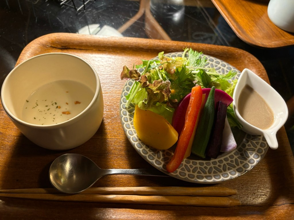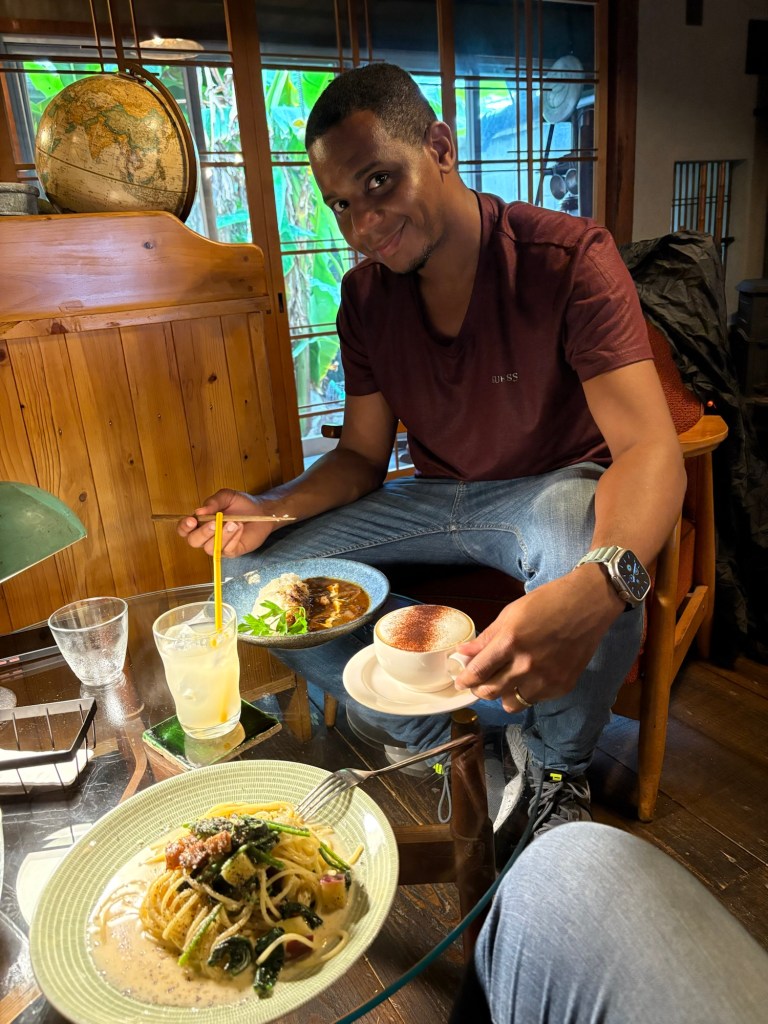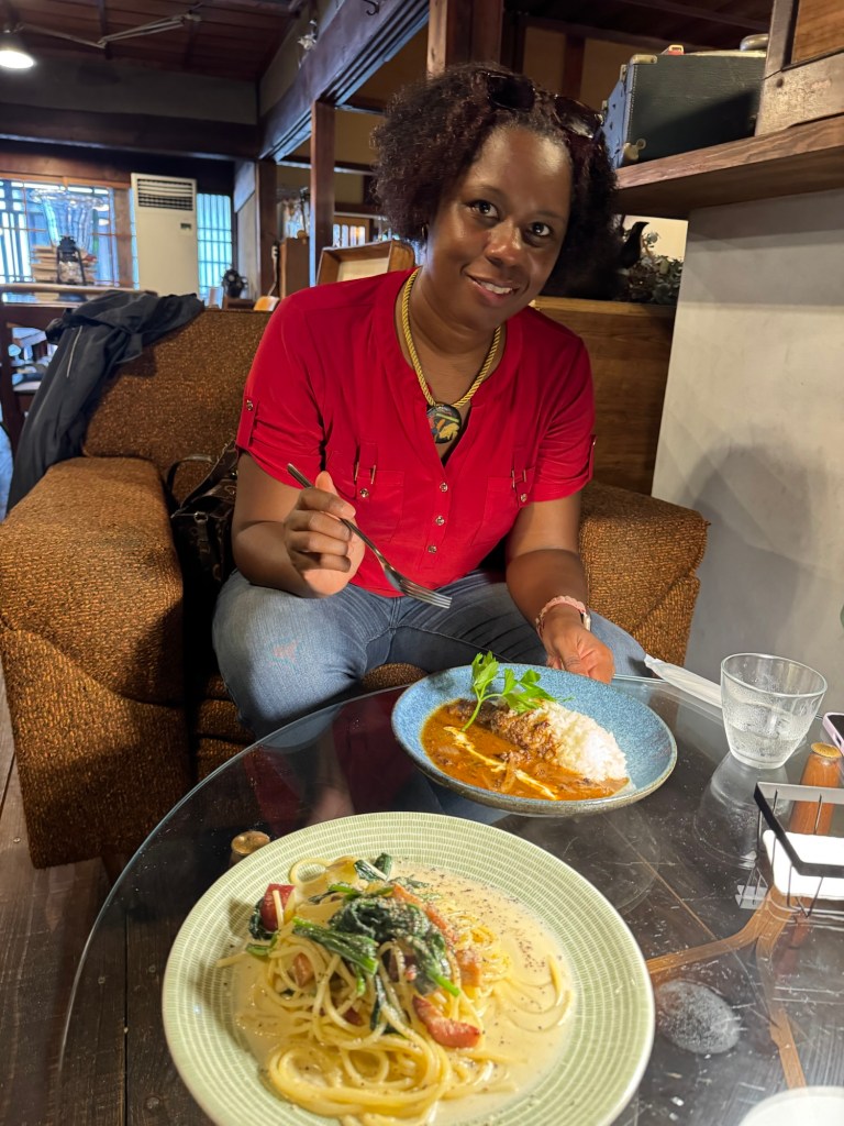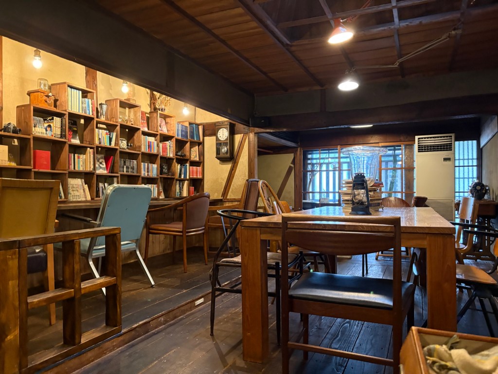 Avant de quitter Nara, nous faisons une pause gourmande dans un charmant café installé dans une vieille maison traditionnelle perdue dans une petite ruelle isolé du centre touristique. La décoration est magnifique : lumière tamisée, livres partout, meubles et objets anciens ainsi qu’un petit jardin extérieur visible en allant dans les toilettes. Les plats sont délicieux de même que les desserts et cafés. Le personnel est aimable, l’ambiance est chaleureuse et décontractée : idéal pour se ressourcer après une longue marche.