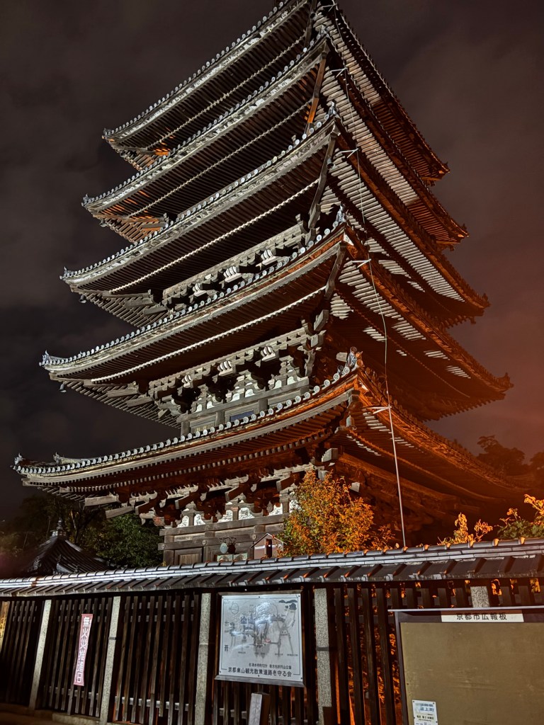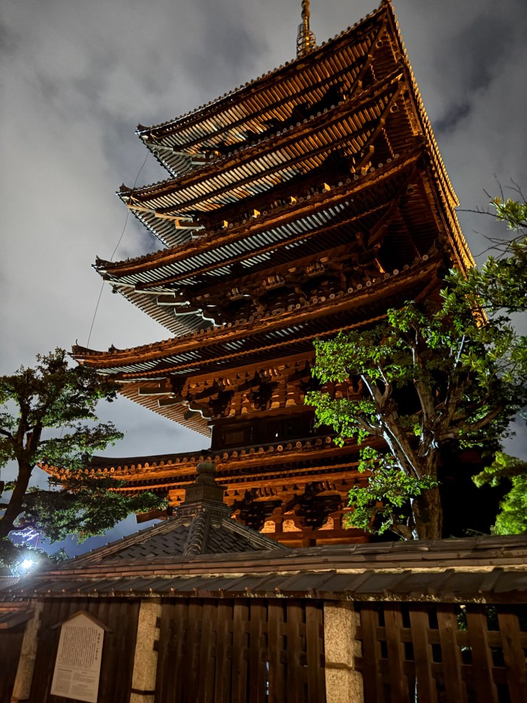 On continue notre balade nocturne dans les petites ruelles jusqu’au célèbre temple bouddhiste Hokan-ji, pagode de 46 mètres de haut, orné de gracieux toits en pente à chaque étage.