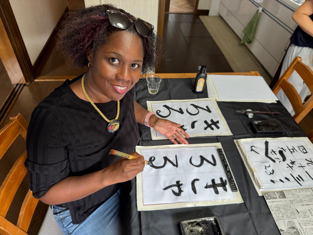 - Et enfin, atelier de calligraphie, pour tracer nos premiers kanji à l’encre noire, concentrés mais heureux de ce moment hors du temps.