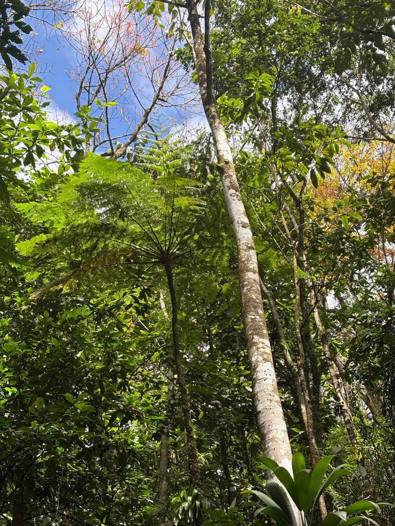 Le sentier s’élève d’abord par un long escalier rustique qui traverse une forêt de mahoganys. Cette première section, assez raide, franchit 150 m de dénivelé en une vingtaine de minutes, jusqu’à atteindre une zone plus plate. C’est juste parfait pour ce mettre en jambe…