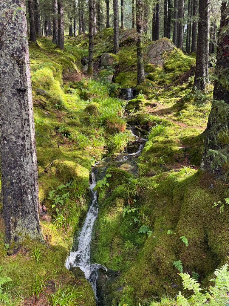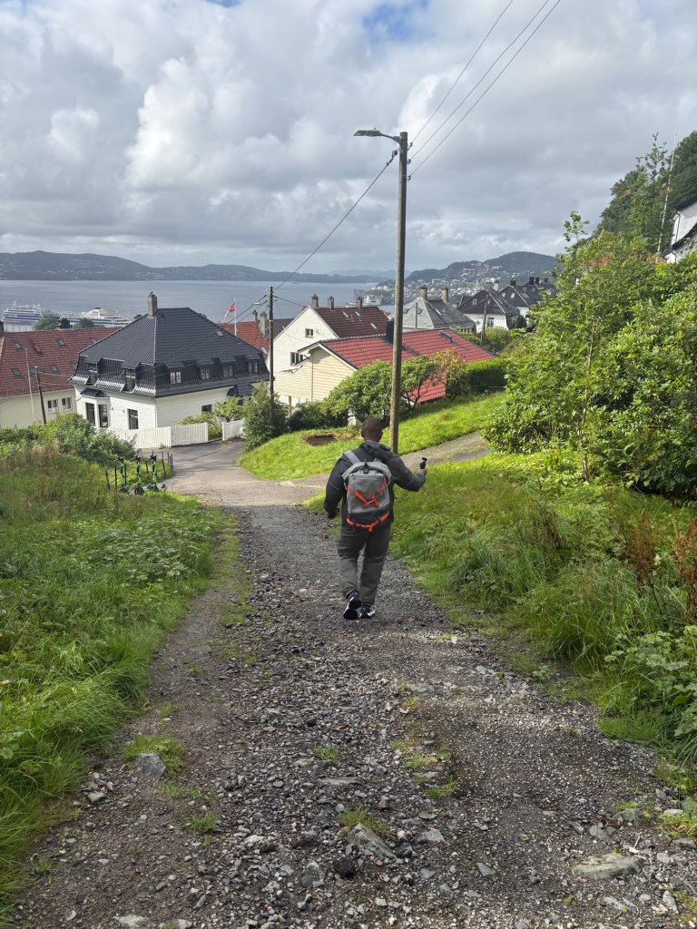 Notre journée commence sur les hauteurs de Bergen. Depuis le sommet du mont Fløyen, accessible en funiculaire ou à pied, la vue est tout simplement spectaculaire. Bergen se dévoile entre mer et montagnes, entre toits colorés et nature verdoyante. Une première cascade s’offre à nous en descendant, modeste mais symbolique : c’est le début de notre immersion dans la nature norvégienne.