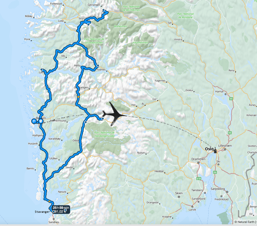 Vous trouverez sur la carte ci-dessous le trajet de notre voyage. Nous avons loué un Van à Bergen, nous permettant d’être libre de dormir dans un logement Airbnb ou des campings afin d’être au plus près de la nature et des paysages grandioses (plus de 1500 km parcourus). Puis vol de Bergen à Oslo où nous sommes restés 3 nuits.