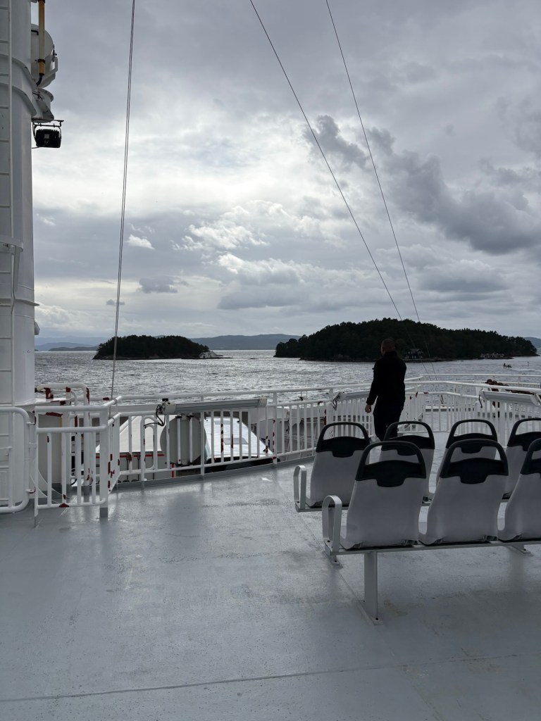 La route est longue près de 5 heures, heureusement qu’on peut se reposer parfois dans les ferrys (surtout pour le conducteur). Les ferrys en Norvège, c’est une expérience en soi : on gare le véhicule dans la soute puis on profite du pont, des salons, cafés et des commodités.